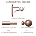 【Patented Klick-Fit Brackets】klick fit curtain pole kits include our patented Klick-Fit brackets allowing for quicker installation and hidden fixings to give your rail a seamless finish. 【Adjustable Length Single Window Rods】The primary feature of an extendable curtain rod is its ability to adjust in length to fit different window sizes. Ours mechanisms is the telescopic rods with inner and outer tubes that slide into each other. Under this mechanism, the rod can be easily extended while maintaining sturdiness. 【Material and Durability Window Curtain Rods】The material of the pipe curtain rod is sturdy iron which is essential for both aesthetic and functional reasons. And it more stronger than other materials. It can hold up to 40 pounds of curtain weight and resist bending or warping over time. 【Finishing and Style Window Poles for Curtains】The finishing and style of the Modern curtain rod play a significant role in the overall appearance of the window treatment. We have two available finishes (e.g., Matt Black, Antique Copper) and two push-fit decorative finials’s design (e.g., Orb Finial, Stud Finial) to match your interior decor and personal taste. 【Easy Installation and Mounting Heavy Duty Curtain Rods】The ease of installation is another aspect of concern. short curtain rods are easy to install without requiring extensive hardware or complex procedures. The mounting options of our curtain pole kit is wall-mounted. And the necessary mounting hardware are included.