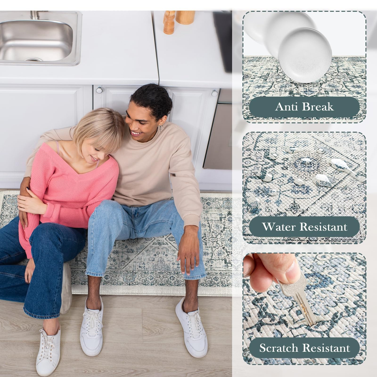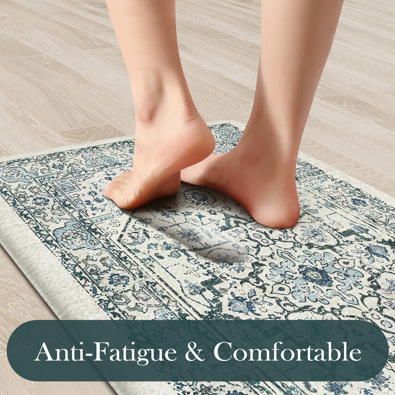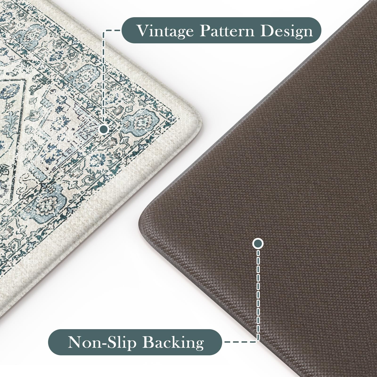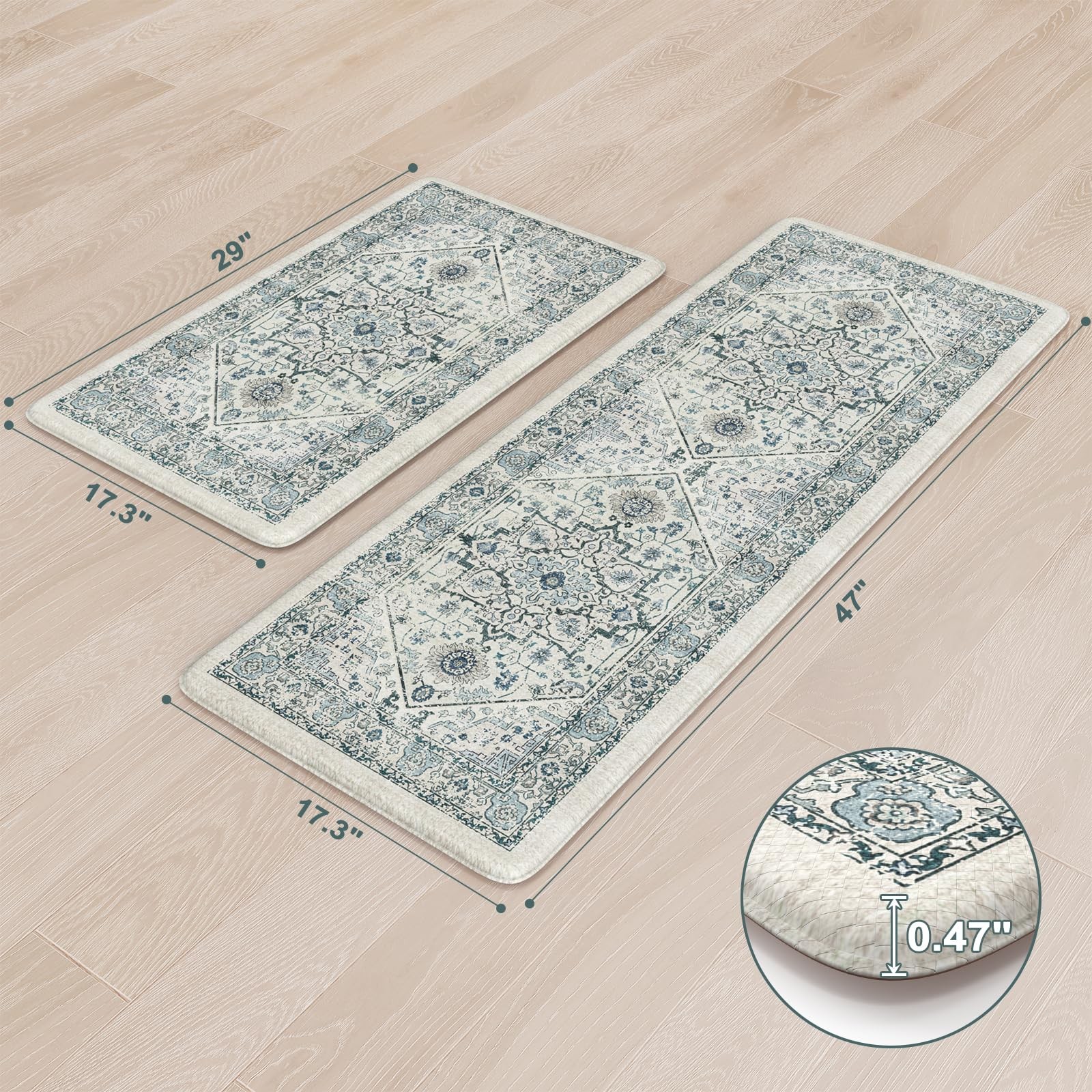 soft anti fatigue mats for kitchen floor waterproof kitchen runner rug non slip padded easy to store comfort long runner rugs for hallways, a popular choice for home decoration Features: 1. Stepping on my feet is as soft as clouds The rectangle vintage bohemian trendy style cushioned kitchen mats for floor provides a luxurious and comfortable touch for any entrance or room. 2. Protecting the floor Kitchen sink mat can effectively lock in dirt and moisture, making your floor cleaner and drier. 3. Sturdy,Anti-Slip and Anti-Stain Padded kitchen floor mats are made of high-quality materials, wear-resistant, ensuring a long service life. 4. Rich colors Mixing different colors together reflects the beauty of art. Perfectly integrated with various interior design styles, enhancing the beauty of the home. 5. Kitchen runner rug with non slip rubber backing The anti slip front door mat indoor entrance will not shift when walking, ensuring the safety of the elderly and children. 6. Anti-Fatigue & Cushion The thickness of 0.47 inches makes it feel relaxed to step on. Stay away from cold and hard floors. 7. Pattern and Richness Tribal collection rug bring a lot of neutrals around your home, you may need a throw rugs with rubber backing for a high traffic area of a room with new carpet. It livens up the living space Suggested size: 17.3" x 29"+17.3" x 47"rug: suitable for indoor areas such as Indoor Door Mats for Entryway,bath mat, entry rug, bedside rug, kitchen mat,entryway runner rug, etc 17.3" x 29""+17.3" x 59" rug: A hallway runner rug, kitchen rugs and runners, rugs for entryway runner, bedroom runner carpet, can also be used in living room, balcony, baby room, bathroom,laundry room,stair etc Anti-Fatigue Kitchen Mat: The size of kitchen rug set are 17.3 "x47"+17.3 "x29", giving you enough standing space for your feet. A thick cushion kitchen mats for floor with a thickness of 0.47 inches can alleviate pressure on the feet and waist Easy to Clean: The surface of anti fatigue mats for kitchen floor is made of sturdy PVC material. When dust and oil fall on the mat, they will not seep in. Simply wipe it with a damp cloth or use a vacuum cleaner. Ergonomic carpet runners can be placed on vinyl floor, tile floor, wooden floor, cement floor, etc Kitchen Rugs Non Slip: This comfortable kitchen floor mat has a TPE anti slip bottom on the back, which can effectively prevent the mat from sliding freely during use. Very suitable for use by the elderly and children. To better utilize this feature, we recommend ensuring that the floor is dry and tidy before placement Vintage Kitchen Mat: With retro, farmhouse, and boho style pattern design, kitchen sink rug can be adapted to different places. You can use comfort standing mat as a kitchen mat, bathroom mat, office mat, laundry room mat, or door mat according to the color tone of different rooms Waterproof Kitchen Floor Mats: The rubber kitchen mat has memory foam function. It can provide some cushioning when the plate falls off. The high-density material prevents moisture from penetrating into padded runner rug, effectively protecting the floor