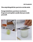 Create Your Own Scented Candle: DIY Candle Kit with Natural Soy Sandalwood, Saffron & Nutmeg A fresh cut of sandalwood is covered with tears of golden resin, which completely saturates the air with sweet nutmeg aromas with light, direct notes of crocus flowers. Successful color solutions: white, beige, black Space: living room, office, lobby, car interior Atmosphere: coziness, hygge, family evenings, late autumn or winter outside the window Aroma card DIY Candle Making Kit Family: tree Notes: sandalwood, saffron, nutmeg Sweetness: ★☆☆ Astringency: ★★☆ Freshness: ★☆☆ Composition of the set 300 grams (10.5 ounces) of natural soy wax Cotton wick Centering rod Naturally DIY candle kit 300 grams (10.5 ounces) of natural, ecological soy-based wax with safe aromas and essential oils. Without parabens, paraffin and phthalates. A true perfume Perfumed aroma filling made in France. Smells like the best candle you could find anywhere. No apples and strawberries from China. Ecologically 100% recyclable packaging. The candle does not leave behind anything that can harm nature. Use and safety techniques Burning time is approximately 60 hours Cut the wick to a length of 0.5 cm (0,19 inch) before each smoking Never leave a lit candle unattended Avoid drafts and contact of the candle with flammable materials Keep away from small children and pets The recommended burning time is not less than 1 hour and not more than 4 hours in a row Soy wax We use exactly 100% soy wax. This wax is clean and safe for your health. It also provides the best aroma output and long-lasting burning. High-quality aroma oils The candles you make will not differ in aroma from the highest quality candles on the market. In addition, aroma oils are certified and do not contain parabens, phthalates and other harmful chemicals. Made in Ukraine Each set is made by hand in Kyiv with pride and care. Create comfort with your own hands You will be amazed by the quality of the candles that you will get, because we have developed a very high-quality mixture of soy wax and natural aroma oil on a par with premium candles of the highest quality. DIY Candle is a candle refill . Inside the package, you'll find everything you need to create a candle: pre-scented soy wax , a wick, and a stick to center the wick in your future candle. To make your own candle, you only need our kit, a container, a microwave or a pot of water, and 5 minutes Make candles as easy as one, two, three... Heat the bag in the microwave for 2.5 minutes. Pour the melted wax into your favorite container. Let the wax harden, trim the wick, and enjoy the fresh scent. How to choose a capacity: They fit Glazed ceramics Strong glass Soldered metal cans Enamel products Non-flammable glasses Do not fit Porous ceramics. For example, terracotta Wood, coconut shells, plastic All flammable materials Can't hold water Dimensions DIY candle kit We recommend using containers no larger than 10 cm (5.39 inches) in diameter, because this is how the wick is calculated. The set includes a 12 cm (6.47 inch) long wick, so the capacity should not be higher than 11.5 cm (6.20 inch) Frequently asked questions (FAQ) DIY candle kit Where can I find a wick and a wick holder? Everything in the package! Yes, everything goes together and in order to make a candle you don't need anything except the DIY Candle package How should I choose a glass? It must be a leak-proof glass with a diameter of up to (10 cm 5.39 inch). Can I make a candle without a microwave? Yes, you can put the DIY Candle package in a pot of water. The package should stand upright over medium heat until the wax in it is completely melted. It takes different time from 8 to 15 minutes depending on your stove and pot. How many candles can be made from one set? Contains 300 grams (10.5 ounces) of wax. This is definitely enough for almost any candle you can find at home. But there is only 1 wick in the set, so if you have wax left after you make a candle, you can order more wicks and make more!