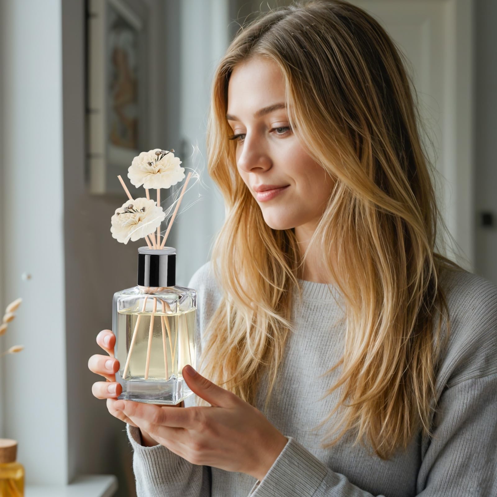 DIY Reed Diffuser Making Kit- Reed Diffuser Making Set with Essential Oils, Flower Reed Diffuser Sticks, 50ml Empty Diffuser Bottle, Home Fragrance Reed Diffuser Gift for Men & Women Craft Your Signature Reed Diffuser: Make your own luxurious diffusers for home! The fragrance diffuser set includes: 1x sweet almond oil, 8x essential oils, 3x glass bottles, 20x reed diffuser sticks, 2x floral reed diffuser sticks, 2x funnels, 2x measuring cups, 2x stirring sticks, 2x gloves, 1x instruction manual and 1x exquisite packaging. Discover the joy of creating personalized scents that reflect your unique style - a truly rewarding creative experience. The Art of Diffuser Scentmaking: Enjoy our essential oils that delicately scent your space for 4-6 weeks. Mix and match our collection of 8 essential oils for diffusers for home to create your perfect aroma: Top Notes: Orange, Lemon, Lavender. Middle Notes: Jasmine, White Tea, Rose. Base Notes: Peppermint, Vanilla. Aroma diffuser isn't just a craft project - home fragrance products is a sensory journey of self-expression and artistic creation. Premium Glass Bottles & Adjustable Scent: 1.7 oz clear glass diffuser bottle crafted with premium-quality glass and durable components, featuring a minimalist design perfect for home use. Reed diffuser set easily customize your fragrance intensity by adding or removing diffuser sticks. For best results, flip the reeds 2-3 times weekly to refresh the scent distribution. Scent Every Space: Dream of a home filled with perfect home fragrance products? DIY diffuser making kit system enhances every environment: bathroom decor, bookshelf decor, hotel collection diffuser, bathroom shelf decor, entryway table decor, room diffuser, bedroom decor, home scent, living rooms, offices. Transform your space into a fresh, peaceful retreat with our long-lasting, mood-boosting fragrances. Best Girls Gift: When you are worried about what gift to give, our DIY reed diffuser set can always impress people. Our indoor fragrance set uses elegant packaging, which is perfect for creating atmosphere on important occasions and festivals. It can be used as a female gift, a teenage girl gift, a perfect gift for mom, Mother's Day gift, Christmas gift, birthday gift, Valentine's Day anniversary gift for women, adults, friends or yourself.