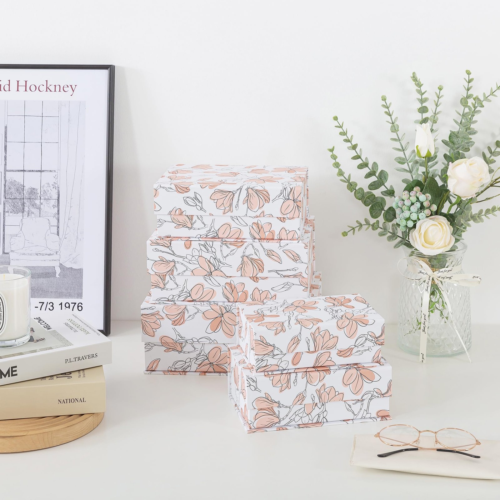 Discover the perfect blend of style and functionality with our set of 5 decorative storage boxes with lids. These elegant keepsake boxes showcase a modern floral sketch pattern in gentle peach tones, bringing both contemporary beauty and organization to your space. Each set includes five spacious boxes that nest together perfectly. From the X-Large measuring 10.2" x 7.9" x 3.9" to the X-Small at 7.1" x 4.7" x 2.4", this comprehensive set provides storage solutions for items of every size. The convenient magnetic closure ensures your items remain secure while allowing easy access. Crafted from high-quality cardboard, these decorative storage boxes are built to last. Whether you're storing photos, organizing craft supplies, preserving memories, or keeping office essentials tidy, these boxes provide both protection and style. The artistic line-drawn floral pattern in soft peach with black sketched details makes these boxes perfect as decorative pieces in any room. They're ideal as memory boxes, photo storage containers, or elegant gift boxes for special occasions. Transform your space with these versatile storage boxes that combine practical organization with contemporary design. The nesting feature allows for space-saving storage when not in use, while the stunning pattern makes them beautiful enough to display proudly in any room. DIMENSIONS: This set of decorative storage boxes with lids includes five sizes - X-Large: 10.2" x 7.9" x 3.9", Large: 9.4" x 7.1" x 3.5", Medium: 8.7" x 6.3" x 3.1", Small: 7.9" x 5.5" x 2.8", X-Small: 7.1" x 4.7" x 2.4". Perfect for organizing items of every size. SECURE MAGNETIC CLOSURE: Each keepsake features a convenient hinged lid with magnetic closure, ensuring your treasured items stay protected. These decorative cardboard boxes provide both and easy access to your belongings. VERSATILE STORAGE SOLUTION: Ideal as memory boxes for preserving precious items, picture boxes for photo storage, or decorative gift boxes for special occasions. Perfect for organizing jewelry, crafts, office supplies, photos, and other cherished items. PREMIUM CONSTRUCTION: Our decorative storage boxes are crafted from durable cardboard for long-lasting use. The sturdy construction ensures these keepsake boxes with lids will protect your valuables while maintaining their beauty. SPACE-SAVING NESTING DESIGN: These nesting storage boxes stack perfectly inside another when not in use, saving valuable space. The elegant line-drawn floral pattern in soft peach tones creates a modern, artistic touch perfect for any room's decor.