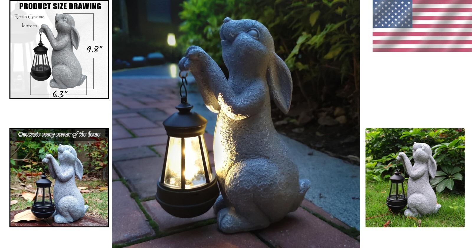 Decorative Solar Rabbit Statue with Lantern - Weather Resistant Outdoor Charm ‹ › ‹ › ‹ › ‹ › ‹ › ‹ › ‹ › ‹ › ‹ › Decorative Solar Rabbit Statue with Lantern Add a touch of enchantment to your yard with our charismatic rabbit figurine, gracefully holding a solar lantern. This delightful outdoor charm not only enhances the beauty of your space but also casts a warm, welcoming glow. Product Details: Unique Design: Dimensions: Rabbit figurine - 9.8 x 6.3 x 4.1 inches; Lantern - 5.5 x 2.75 x 2.75 inches. Durable Materials: Crafted from high-quality resin and hand-painted with a UV resistant coating to withstand the elements without fading. Solar Powered: Fully powered by renewable energy; the solar panel efficiently converts sunlight into energy, lighting up your space while being eco-friendly. Simple Operation: Easy to use—just press the switch and place your hand on the solar panel to ensure it's activated. Automatically charges in daylight and illuminates at night for 8-10 hours after a full charge. A Perfect Gift: Ideal for animal lovers and those looking to enhance their fairy garden. An elegant addition for patios and lawns, it also makes a thoughtful housewarming, anniversary, or birthday gift. Exceptional Service: Our dedicated team is here to assist you with any inquiries about the Rabbit solar statue, guaranteeing your satisfaction and ensuring the highest quality in service. Why Choose Our Decorative Solar Rabbit Statue? Transform your outdoor space into a sanctuary of charm and warmth with this unique rabbit statue. Whether illuminating cozy evenings on the patio or gracing your lawn in style, this solar-powered beauty not only enhances your aesthetic but adds a sustainable glow. Give a gift of elegance, enchanting moments, and lasting memories - order yours today! Shipping Free & Fast Shipping - We offer free shipping to most of the USA with a normal delivery time of 3-7 days. However, due to the current situation, additional delivery time (up to 3 weeks) may be required for some items. Alternative Carriers - We may use alternative carriers (e.g. USPS, FedEx, UPS, etc.) to ensure your package arrives safely and on time. Due to the use of multiple carriers, we are unable to provide a tracking number automatically. Handling Time - Orders are processed and shipped within 1-2 business days of receiving cleared payment. Shipping Restrictions - Shipping to Alaska, Hawaii, Puerto Rico, Guam, and other US territories may incur shipping charges or delivery restrictions. Please contact us before ordering, or your order can be refunded/cancelled. State Restrictions - There may be restrictions based on your state of purchase. For example, certain items may not be shipped to California due to state regulations. Contact for Tracking Updates - If you require tracking updates or have any concerns about the delivery of your order, please feel free to contact us, and we will be happy to assist you. Return 30-Day Hassle-Free Returns - We want you to be completely satisfied with your purchase. If you are not, you can return the item within 30 days of receiving it for a full refund or exchange. Easy Return Process - To start a return, simply contact us and we will provide you with a prepaid return shipping label and detailed instructions. Restocking Fee - There are no restocking fees for returns. However, the buyer is responsible for return shipping costs if the return is not due to a seller's error. Refund Processing Time - Refunds will be processed within 5 business days of receiving the returned item in its condition. Payment We accept all major credit cards, PayPal, and Apple Pay for your convenience. Your payment information is secure and encrypted to ensure a safe and seamless transaction. Please complete your payment within 3 days of purchase to avoid any delays in shipping. Feedback Your feedback is extremely important to us. We strive to provide the best products and customer service possible. If you are satisfied with your purchase, please take a moment to leave us a positive review. If you have any concerns or issues with your order, please contact us before leaving negative feedback. We are committed to resolving any problems and ensuring your satisfaction. Contact Us If you have any questions or concerns, please feel free to out to our customer support team. You can contact us through the eBay messaging system. We are available Monday to Friday, 9:00 am to 5:00 pm EST, and we will do our best to respond to your inquiry within 24 hours. Buy it now and enjoy a pleasant shopping experience! Unit Quantity: 1 Material: Resin Area of Use: Balcony,Lawn,Yard Power Source: Solar Features: LED,Water Resistant,Energy Efficient Care Instructions: Clean with Dampen Cloth Type: Garden Statue Shape: Rabbit Subject: Animal Indoor/Outdoor: Outdoor Size: Medium Color: Rabbit Style: Retro Occasion: Housewarming Finish: Painted Item Weight: 1.79 lb Unit Type: lb