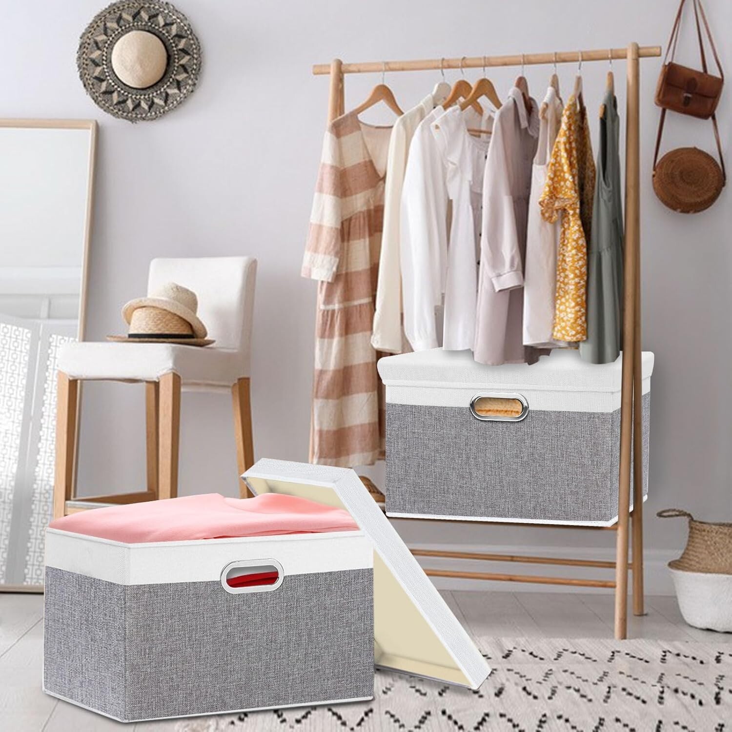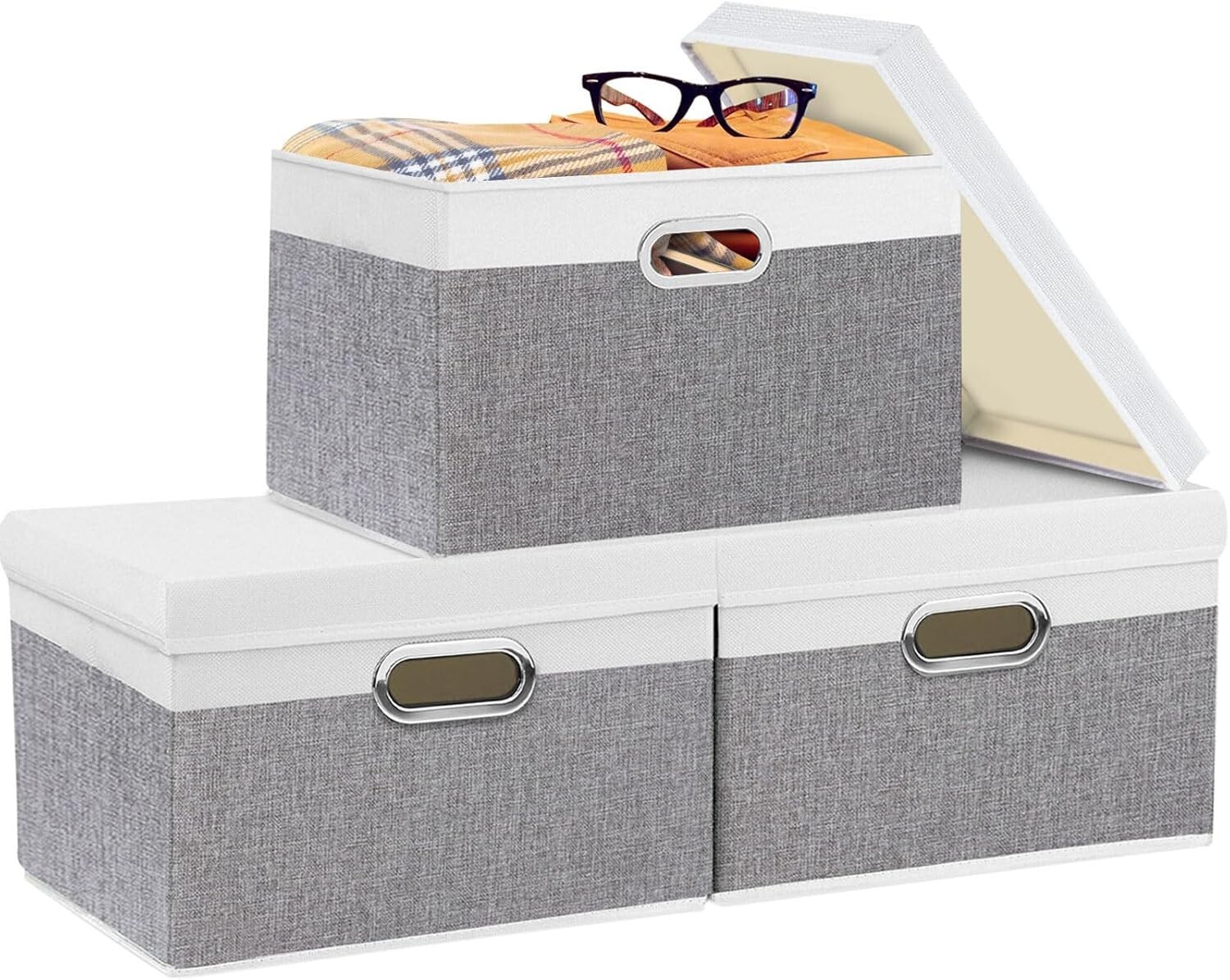 Storage Bins with Lids, Decorative Storage Boxes Comes with 2 Metal Handles, Waterproof Storage Basket Bins, Closet Storage Containers, White/Gray, ''''''H, 3-Pack Material: This fabric storage bins with lids are made of durable and breathable linen fabric with the high quality pp board on the sides and bottom, Waterproof and moisture-proof Foldable with Lids Design : Unique foldable and stackable design to save space in your room. The design with cover storage chest can prevent dust from entering and avoid the trouble of frequent cleaning, make clothes keep clean Convient 2 Handles : 2 metal handles for carring things heavy, This design makes it easy to pull the Storage Organizer Bins from closet while keeps them from getting flimsy as they last Multi-Purpose Organizer : These organizers can be placed in the living room or bedroom to store clothes, accessories, magazines, etc. This is great for saving space and keeping things tidy Easy to Assemble : Just take out from the package and insert the bottom panel, Just put the lid on. And closet Boxes with Lids are foldable for saving space when not in use