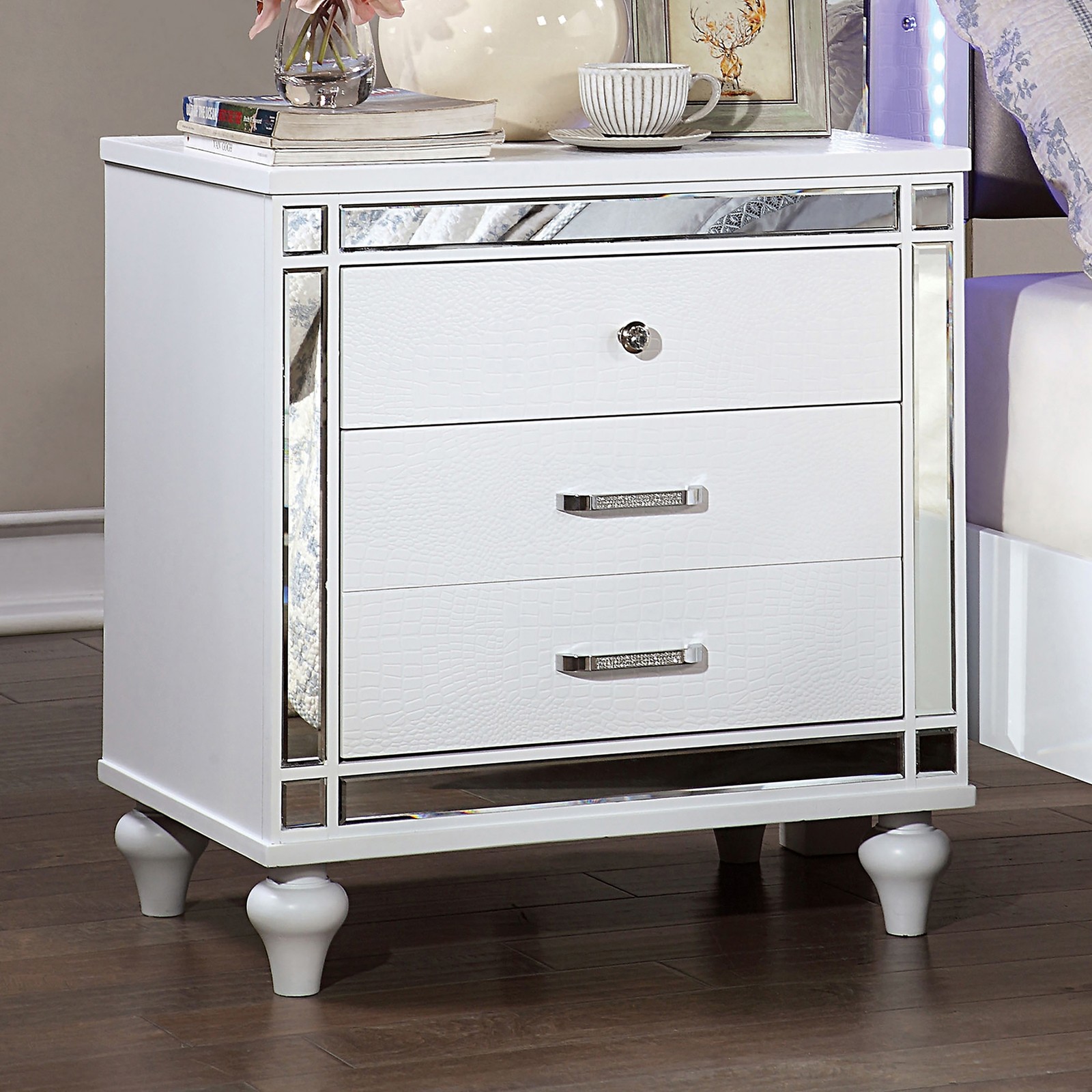 Celebrate modern glamour with the clean white finish and mirror trim that highlight this sparkling three-drawer nightstand. Dimensional drawer fronts show off gorgeous croc texture and glittering pulls while decorative legs add classic appeal.Features:PLENTY OF STORAGE - 3 drawers, providing you ample storage of your cell phone, books and other home itemsEASY ASSEMBLY - Comes prepacked and delivered right to your front door, minimal assembly requiredSPARKLE - Glittering bar pulls and crystal-like knobIncludes 1 nightstandAvailable in three (3) color options: Black, Silver or WhiteModern glam styleFaux croc texturing and mirror trimReflective glossy finishMirror trim reflects brilliantly from Nightstand's facadeFelt-lined top drawers for more delicate itemsSolid wood legs and framework Free Shipping Over $49.99* Details Derc Glam Solid Wood 3-Drawer Nightstand by Furniture of America Product Description: Celebrate modern glamour with the clean white finish and mirror trim that highlight this sparkling three-drawer nightstand. Dimensional drawer fronts show off gorgeous croc texture and glittering pulls while decorative legs add classic appeal. Features: PLENTY OF STORAGE - 3 drawers, providing you ample storage of your cell phone, books and other home items EASY ASSEMBLY - Comes prepacked and delivered right to your front door, minimal assembly required SPARKLE - Glittering bar pulls and crystal-like knob Includes 1 nightstand Available in three (3) color optionsBlack, Silver or White Modern glam style Faux croc texturing and mirror trim Reflective glossy finish Mirror trim reflects brilliantly from Nightstand's facade Felt-lined top drawers for more delicate items Solid wood legs and framework offer a smooth appearance and durable support Veneer surface crafted from engineered wood for consistent finishes and resistance to cracking Ball bearing metal glides Assembly required Comes with assembly instructions Measurements: Overall29.25 inches high x 28 inches wide x 18 inches deep Weight capacity75 pounds Weight59 pounds Whether you are a deal seeker, trendsetter or just window shopping, Furniture of America® is there for your every need. You'll find that we offer every style, from rustic farmhouse and urban industrial to french antique, mid-century modern, and glamorous chic; we welcome you to explore our ample style possibilities to find the perfect pairing for your personality. Furniture of America ® is proud to be the family friend that always has your back. Product Care: Wipe surfaces clean with a soft, dry cloth Do not use chemical cleansers, abrasive cleaners or furniture polish This product will ship to you in one (1) box.