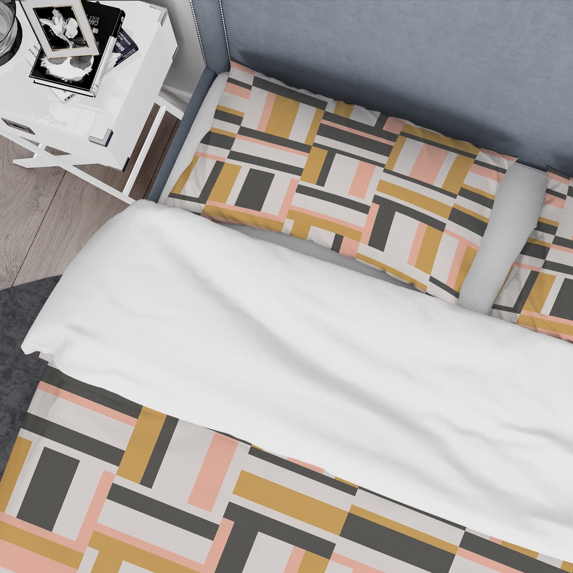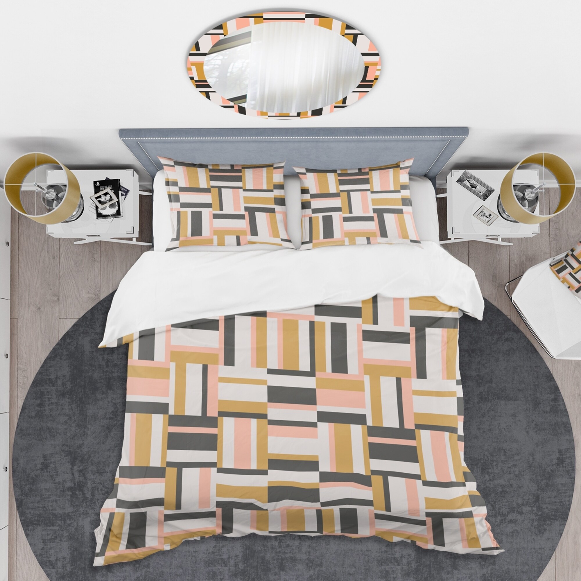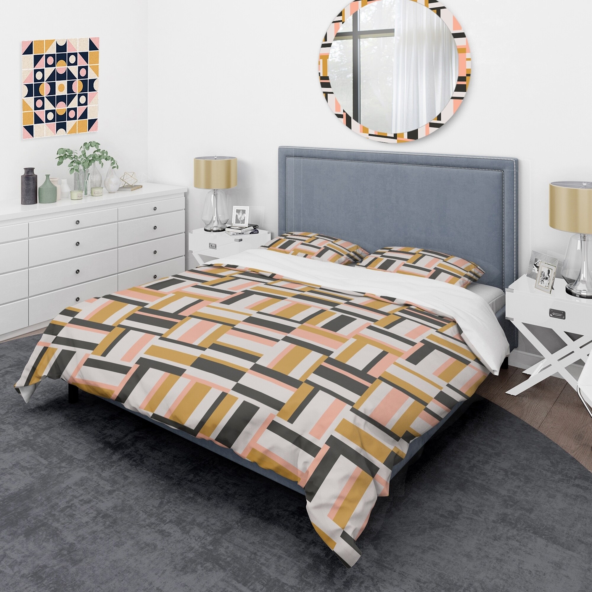 Add a pop of color and style to your bedroom with this luxurious mid-century modern duvet cover set. The vibrant colors are created using high density Italian ink on ultra-soft, wrinkle-resistant microfiber polyester fabric. The set includes one duvet cover and two pillow shams, available in twin, queen, and king sizes. The elegant and soft colors are both trendy and fun to brighten and update your bedroom. Made in Canada.Features: High density Italian ink creates extra vibrant colors Ultra-soft, lightweight, wrinkle-resistant 100% microfiber polyester fabric Includes one duvet cover and two pillow shams for a complete and stylish look Trendy mid-century modern style with a vintage abstract pattern Made in Canada Comforter and pillow inserts not includedKing: Duvet Cover: 104 inches Free Shipping Over $49.99* Details Designart 'Abstract Retro Geometric IX' Mid-Century Duvet Cover Set Product Description: Add a pop of color and style to your bedroom with this luxurious mid-century modern duvet cover set. The vibrant colors are created using high density Italian ink on ultra-soft, wrinkle-resistant microfiber polyester fabric. The set includes one duvet cover and two pillow shams, available in twin, queen, and king sizes. The elegant and soft colors are both trendy and fun to brighten and update your bedroom. Made in Canada. Features: High density Italian ink creates extra vibrant colors Ultra-soft, lightweight, wrinkle-resistant 100% microfiber polyester fabric Includes one duvet cover and two pillow shams for a complete and stylish look Trendy mid-century modern style with a vintage abstract pattern Made in Canada Comforter and pillow inserts not included King: Duvet Cover104 inches wide x 88 inches long King Shams20 inches wide x 36 inches long Queen: Duvet Cover88 inches wide x 88 inches long Standard Shams16 inches wide x 26 inches long Twin: Duvet Cover68 inches wide x 88 inches long Standard Sham16 inches wide x 26 inches long Product Details: MaterialPolyester PatternGeometric ColorMulti-color StyleVintage Abstract, Mid-Century Modern, Abstract ReversibleNo Care Instructions: Machine wash on cold gentle cycle. Wash separately on first wash. Use only non-chlorine bleach when needed. Tumble dry low. Remove promptly.