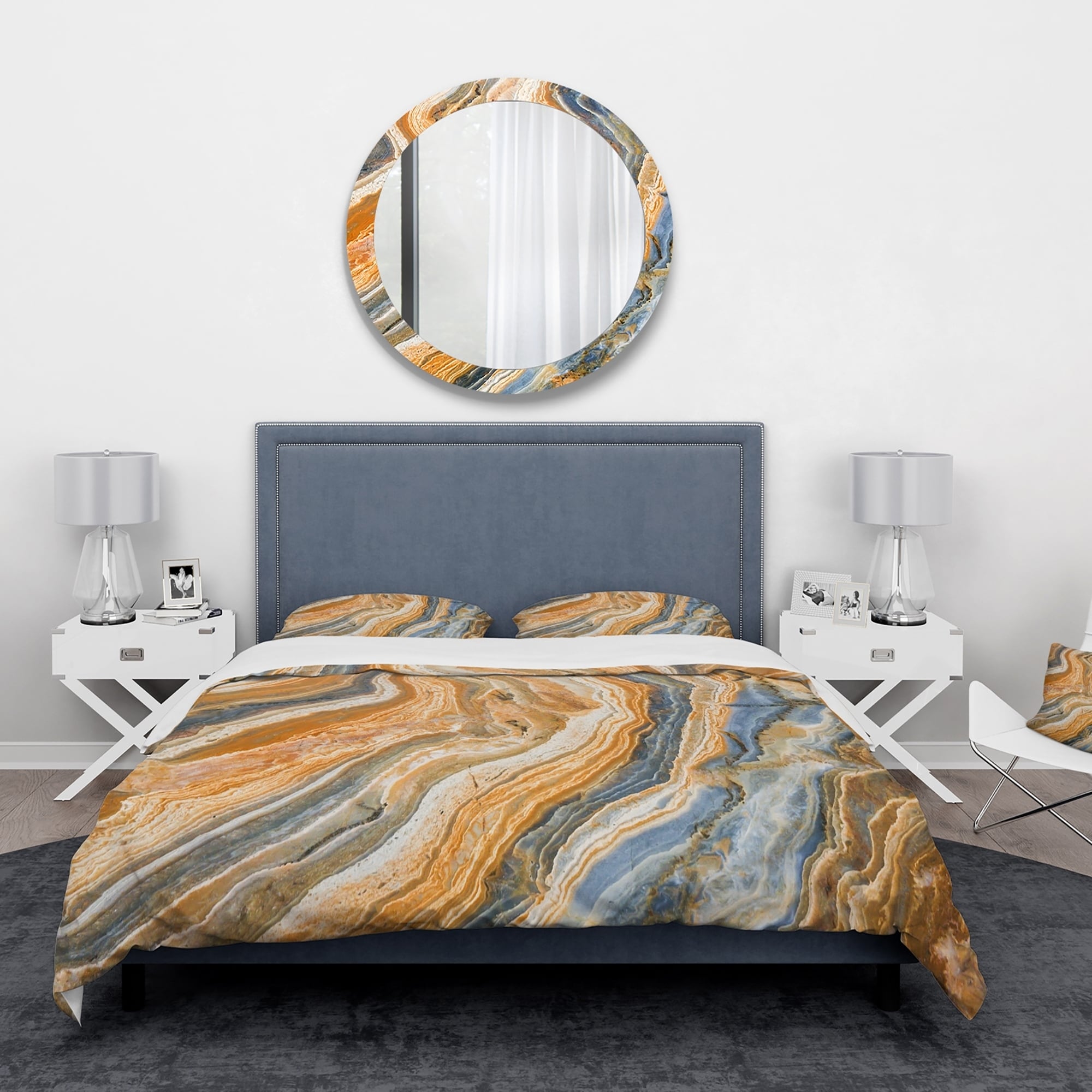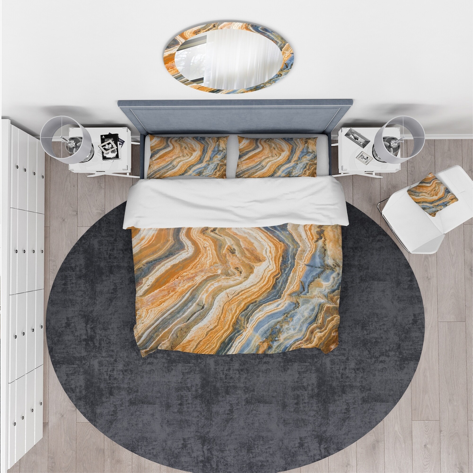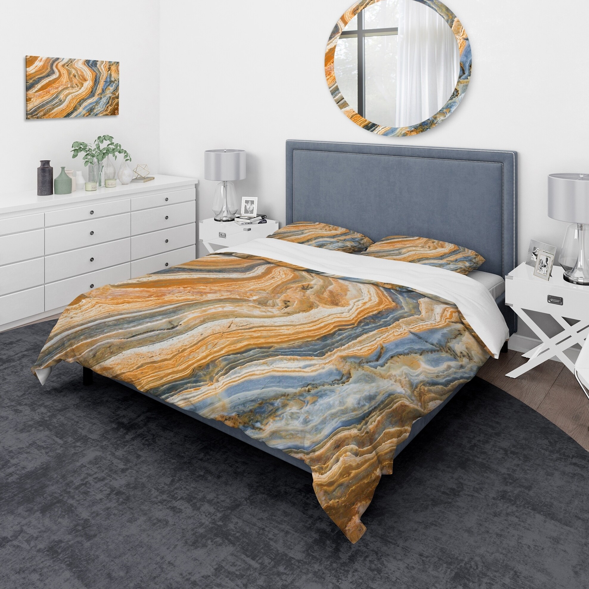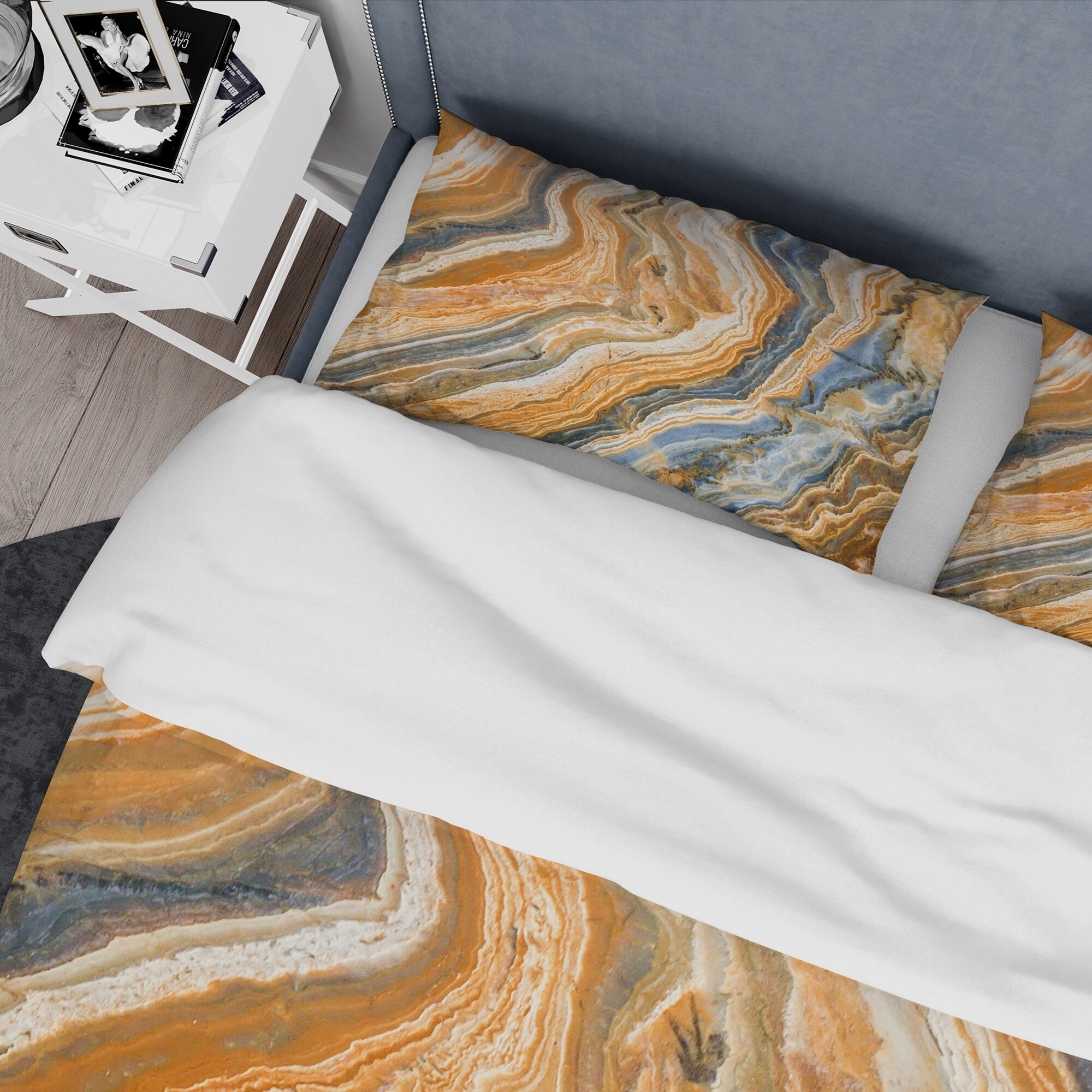 Transform your bedroom into a luxurious retreat with the Designart 'Segment Layers of Marbled Rock' Abstract Bedding Set. Featuring a stunning and vibrant abstract design printed using high density Italian ink, this set adds a touch of elegance to any decor. Made from 100% microfiber polyester, the bedding set is ultra-soft and cozy, ensuring a good night's sleep. The set includes one duvet cover and two shams, available in twin, queen, and king sizes. Machine washable for easy care.Features: Vibrant colors printed with high density Italian ink Made from ultra-soft, lightweight 100% microfiber polyester Wrinkle resistant fabric with down-like comfort and no odor Includes one duvet cover and two standard pillow shams Trendy and fun color scheme to brighten up your bedroom Made in Free Shipping Over $49.99* Details Designart 'Segment Layers of Marbled Rock' Abstract Bedding Set - Duvet Cover & Product Description: Transform your bedroom into a luxurious retreat with the Designart 'Segment Layers of Marbled Rock' Abstract Bedding Set. Featuring a stunning and vibrant abstract design printed using high density Italian ink, this set adds a touch of elegance to any decor. Made from 100% microfiber polyester, the bedding set is ultra-soft and cozy, ensuring a good night's sleep. The set includes one duvet cover and two shams, available in twin, queen, and king sizes. Machine washable for easy care. Features: Vibrant colors printed with high density Italian ink Made from ultra-soft, lightweight 100% microfiber polyester Wrinkle resistant fabric with down-like comfort and no odor Includes one duvet cover and two standard pillow shams Trendy and fun color scheme to brighten up your bedroom Made in Canada Comforter and pillow inserts not included Additional Details: MaterialPolyester PatternFloral/Flower ColorOrange StyleTraditional Floral/Flower, Traditional, Abstract ReversibleNo King: Duvet Cover104 inches wide x 88 inches long King Shams20 inches wide x 36 inches long Queen: Duvet Cover88 inches wide x 88 inches long Standard Shams16 inches wide x 26 inches long Twin: Duvet Cover68 inches wide x 88 inches long Standard Sham16 inches wide x 26 inches long Care Instructions: Machine wash on cold gentle cycle. Wash separately on first wash. Use only non-chlorine bleach when needed. Tumble dry low. Remove promptly.
