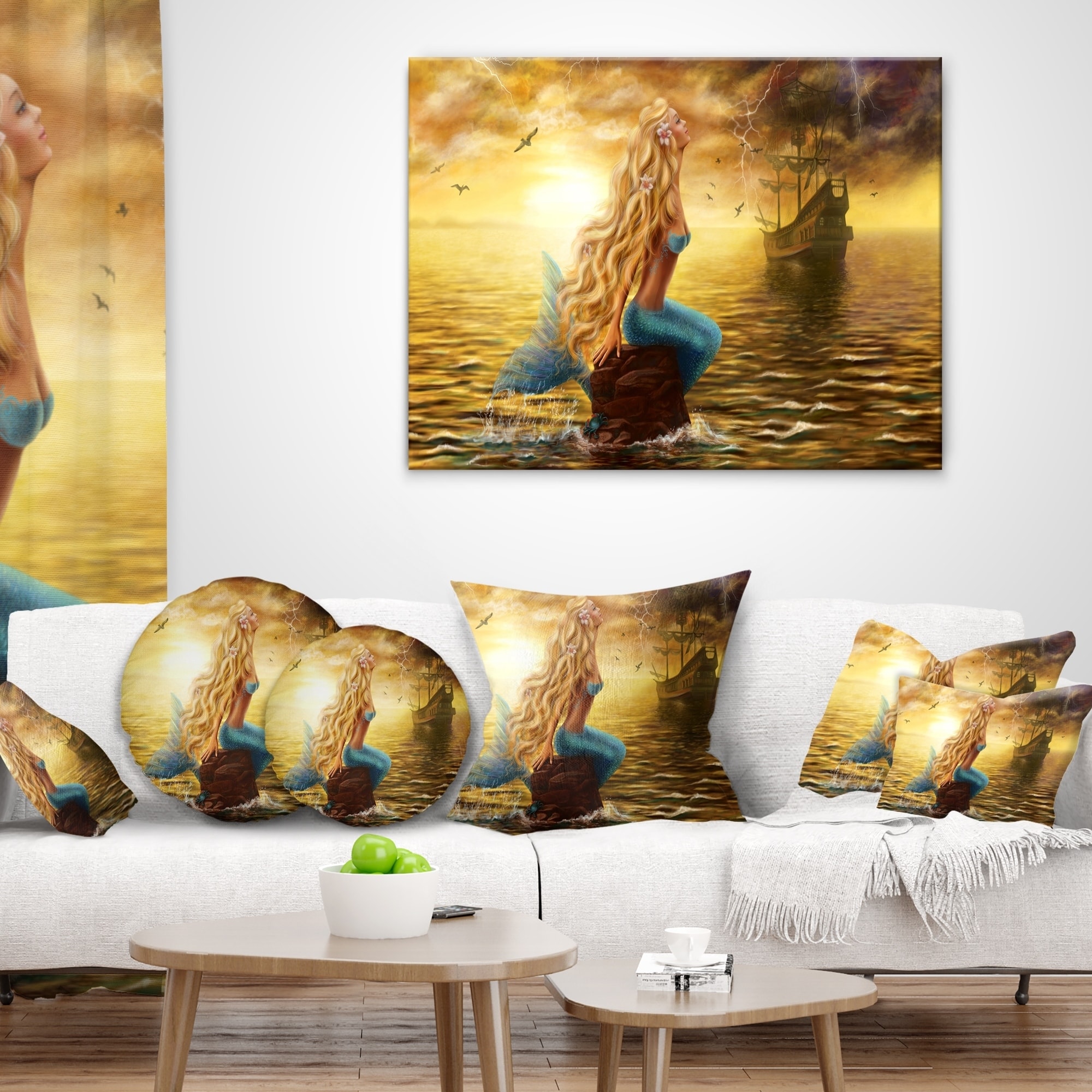 Decorative Throw Pillows for Couch Bed Sofa with Zip CoversAn easy, fun way to add a pop of color or bring new life to any room in your home or office is with these beautiful Sea & Shore throw pillows. Dress up your bed, sofa or lounger with this decorative design art pillows. Perfect as Beach bedroom décor, lounge décor Coastal living room décor. It adds a fun accent to any room. Throw pillows really do work wonders: they can transform any room from uninviting discomfort to warm and welcoming. And they really do go almost anywhere - arrange a couple on the couch or sofa, place one in your overstuffed chair for extra coziness, toss a couple on the bed and prop yourself up for a great read.These Sea & Shore pillow is printed using High Color Density Italian inks to create a vibrantly Free Shipping Over $49.99* Details Designart 'Sea Mermaid with Ghost Ship' Seascape Throw Pillow Product Description: Decorative Throw Pillows for Couch Bed Sofa with Zip Covers An easy, fun way to add a pop of color or bring new life to any room in your home or office is with these beautiful Sea & Shore throw pillows. Dress up your bed, sofa or lounger with this decorative design art pillows. Perfect as Beach bedroom décor, lounge décor Coastal living room décor. It adds a fun accent to any room. Throw pillows really do work wondersthey can transform any room from uninviting discomfort to warm and welcoming. And they really do go almost anywhere - arrange a couple on the couch or sofa, place one in your overstuffed chair for extra coziness, toss a couple on the bed and prop yourself up for a great read. These Sea & Shore pillow is printed using High Color Density Italian inks to create a vibrantly colored, sharp artwork. Features: Perfect accent to any furniture piece Basic shapes with a modern graphic design twist Printed on ultra smooth and 100% light weight polyester Cushion filled with 100% polyester fill Wrinkle resistant fabric Zip Closure so you can remove the pillow from its' cover Down-like comfort - Odorless 100% Hypoallergenic Machine Wash Cold Separately, Gently Cycle Only, No bleach, hang to dry Print on Demand with High Density Italian Ink Available in Several sizes Attribute :Beach, Coastal, Tropical Subject Sea & Shore, Nautical, Landscapes