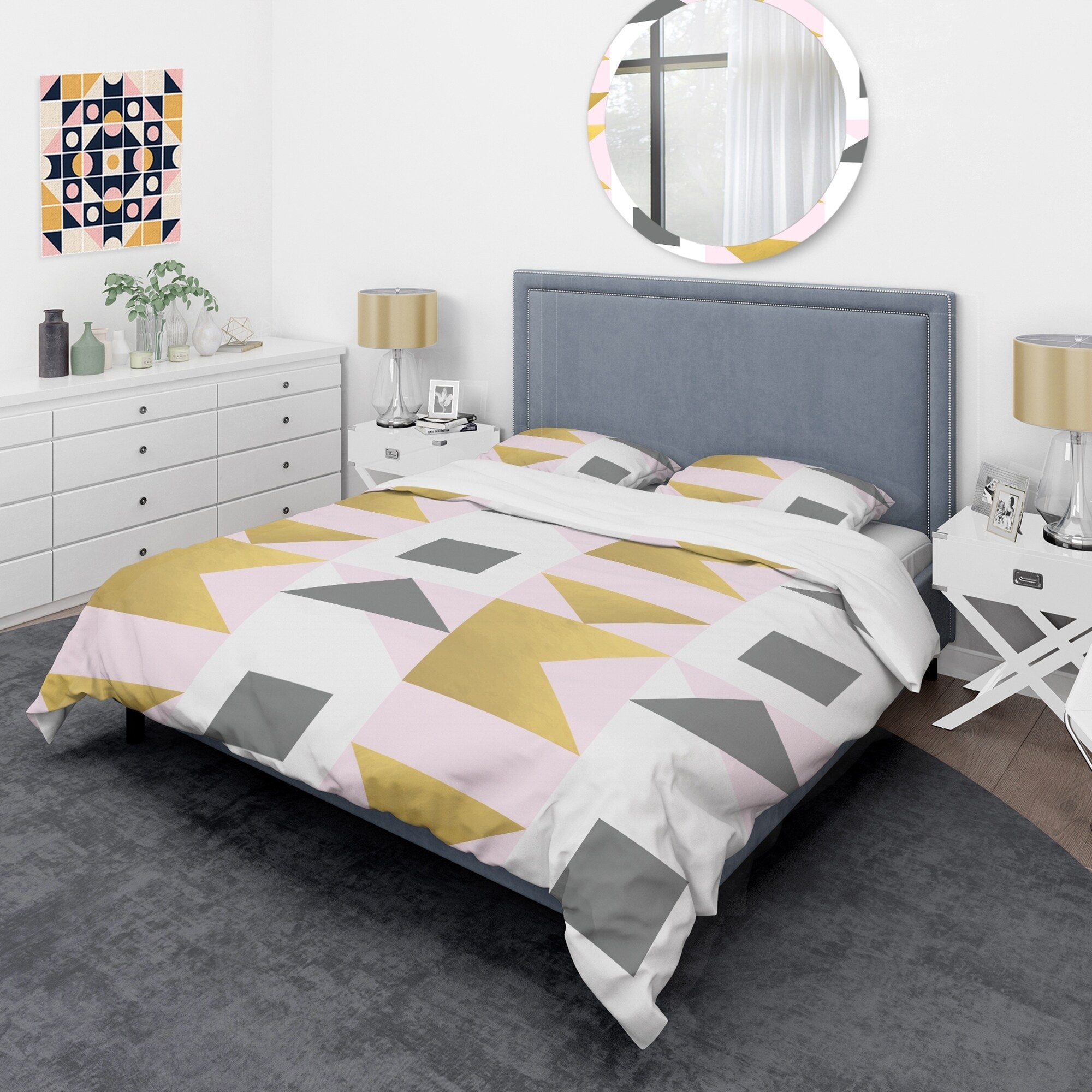 Add some glamour and style to your bedroom with this Designart 'Triangular Gold Design' Mid-Century Duvet Cover Set. This luxurious set comes in vibrant colors thanks to high density Italian ink and is made of 100% microfiber polyester, ensuring a comfortable sleep. The set includes one bed cover and two pillow shams, available in twin, queen, and king sizes. It is wrinkle-resistant and odorless, making it an ideal choice for a modern bedroom. Add matching decorative wall art and throw pillows, available separately, to complete the look. Made in Canada.Features: Vibrant colors printed using High Density Italian Ink Made of 100% microfiber polyester for ultra-soft comfort Includes one bed cover and two standard pillow shams Stylish Mid-Century Modern design perfect for a trendy bedroom Free Shipping Over $49.99* Details Designart 'Triangular Gold Design' Mid-Century Duvet Cover Set Product Description: Add some glamour and style to your bedroom with this Designart 'Triangular Gold Design' Mid-Century Duvet Cover Set. This luxurious set comes in vibrant colors thanks to high density Italian ink and is made of 100% microfiber polyester, ensuring a comfortable sleep. The set includes one bed cover and two pillow shams, available in twin, queen, and king sizes. It is wrinkle-resistant and odorless, making it an ideal choice for a modern bedroom. Add matching decorative wall art and throw pillows, available separately, to complete the look. Made in Canada. Features: Vibrant colors printed using High Density Italian Ink Made of 100% microfiber polyester for ultra-soft comfort Includes one bed cover and two standard pillow shams Stylish Mid-Century Modern design perfect for a trendy bedroom Made in Canada Actual comforter inserts and pillow inserts are not included. Machine washable on cold gentle cycle