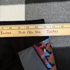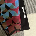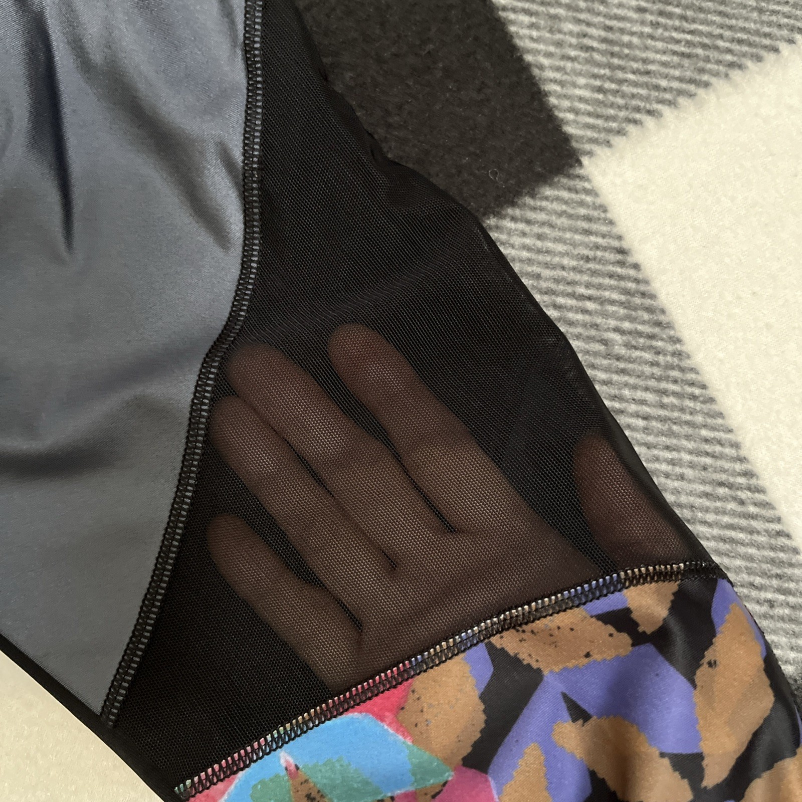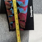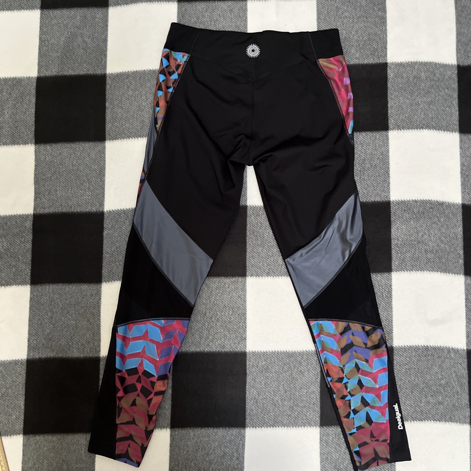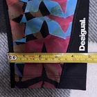 Pre-owned in good condition- minor signs of wear. The pattern is geometric and multicolored. The back of calf areas are sheer. The length of the pants from waist to hem is about 35 inches. Rise is about 10 inches. Waist is about 28 inches. May run small. Please see all photos for condition and measurements.