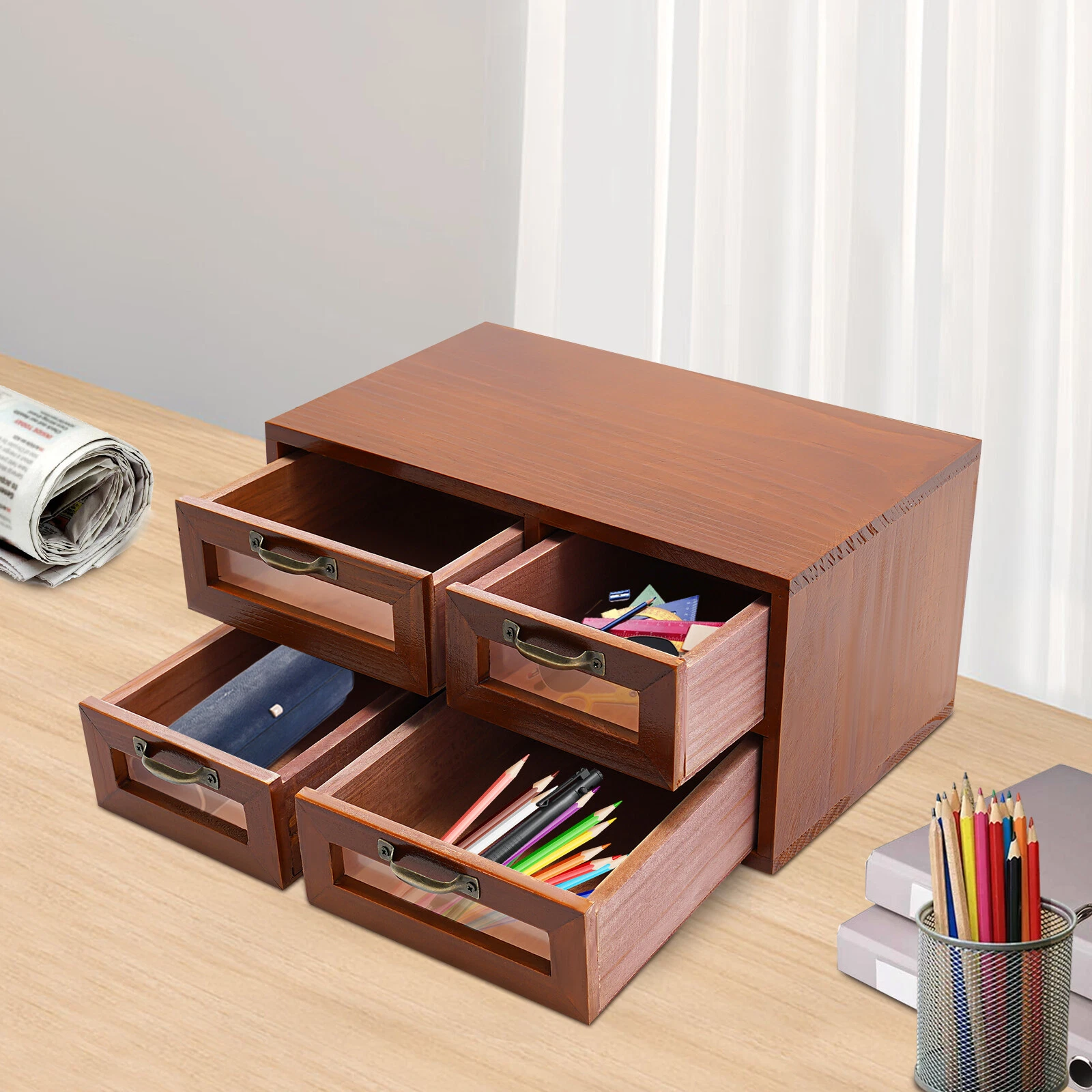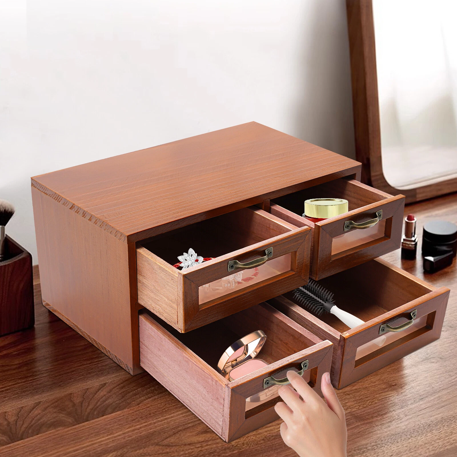 Desk Organizer with Drawers Wooden Desktop Storage Cabinet Storage Box, 4 Drawer Application It can be placed on the dresser to store necklaces, earrings, bracelets, rings, crystals, cosmetics, perfumes, and lipstick, placed in the kitchen to store teabags, espresso coffee pods, sugar packets, placed in the living room to organize medicine, keys, watches, receipts, credit cards. It is also an office organizer to store electronics, small cords, chargers, batteries, pens, letters, staplers, and pictures. It is ideal for craftsmen to organize sewing pins, buttons, tool bits, and small precision tools. Package Included 1* Desktop Organizer 4* Drawers Specification Color: Dark Brown Style: Retro Shape: Rectangle Mount Type: Tabletop Material: Solid Wood, Plastic, Iron Assembly Required: No Number of Drawers: 4 Total Load-bearing Capacity: 4kg/8.82lbs Gross Weight: 1.8kg/3.97lbs Net Weight: 1.5kg/3.31lbs Large Drawer Width: 15cm/6in Small Drawer Width: 12cm/4.7in Package Size: 33*21*18cm/12.99*8.27*7.09in Overall Product Size: 30*18*15cm/11.8*7*6in Description Do you feel annoyed by too many items on your desktop that are cluttered and unorganized? Our desktop organizer can help you solve this problem. It is made of high-quality material which ensures a long service life. The 4 drawers are convenient for you to organize different daily items. The handle makes it convenient for you to open the drawer. In a word, it can effectively help you reduce the pressure on your countertop, which is an ideal choice for you. Key Features Build to Last: The solid wood and plastic make it strong, hard to deform, resistant to corrosion, and environmentally friendly, so it can be used for a long time. Storage Assistant: 4 drawers allow you to organize and store cosmetics, jewelry (all are not included), and more. In addition, the top platform allows you to place toiletries, books (all are not included), etc., making your items neat and orderly. Retro Appearance: The dark brown color presents a retro style, adding beauty and vintage elements to your room. It plays a unique decorative role while using, bringing an old-world charm into your new-world home. Stable Construction: The thickened material and rectangular structure give it excellent stability and make it capable of supporting a weight of 8.82 lbs, meeting your needs for storing various items without tipping over. Effortless Cleaning: Thanks to the smooth surface and simple construction, you can easily wipe off the dirt on it with a soft cloth. Compact and Lightweight: The product is compact (11.8*7*6in) and lightweight (3.31 lbs), so you can effortlessly carry it or conveniently place it on various tabletops. Thoughtful Gift: This is an ideal gift for colleagues, friends, and family to help them organize their belongings and keep their desks tidy. Protective Package: To prevent the product from being damaged during transportation, we packed it with bubble bags to protect your products to the maximum extent possible. Good Customer Service: We stand behind all our guests and look forward to assisting you with your purchase. It is our pleasure to answer your confusion and questions. The end of the story between us is not "we sell and you buy". Details Convenient Handle: The iron handle is durable and makes it convenient for you to open the drawer. Smooth Edge: The rounded and smooth edges not only add to the aesthetics of the product but also improve the safety of use. Notes Please note that this product does not include any other items. Please check the size carefully before ordering. Please do not place it in a damp place or near an ignition source. Please allow the slight color difference caused by the shooting light and the 1-3 cm error due to manual measurement, and make sure you do not mind before ordering. Payment Delivery details Terms of sales About us Contact us Payment We accept ebay payment 。 Fees such as import duties, taxes are not included in the item price or shipping costs. These charges are the buyer's responsibility. Delivery details Shipping: 2-9 working days to: USA Terms of sales We maintain high standards of excellence and strive for hundred percent customer satisfaction. Feedback is very important to us. We hope that you contact us immediately before you give neutral or negative feedback, so that we can address your concerns. It is impossible to address issues if we do not know about them! About us Your satis faction is our ultimate goal. We work hard to earn your trust and future business. Our certified technicians have tested each item before shipping. The unit comes with 1 year limited warranty on all manufacturing defects. a) If you receive a defective item, you may return it or ask for a discount. Please contact us within 14 days after you receive the package. b) What you returned must be intact and in its original packaging as re? u. Customer is responsible for shipping costs of the returned item. c) We will cover the cost of shipping back t with the shipping rate indicated in the registration page. We will send you a new unit or refund the full payment you paid. Thank you. Contact us Business Hour Business Hour: Monday To Friday: 8:30 AM to 5:00 PM (Beijing China time) Due to time zones, our reply to your questions may not be immediately. But within above working time, we will reply your email within 24 hours. If it's non-workdays, please kindly be patient and wait till Monday. Please contact us with ebay message. Please feel free to contact us if you have any questions. Monday To Friday: 8:30 AM to 5:00 PM (Beijing China time) Due to time zones, our reply to your questions may not be immediately. But within above working time, we will reply your email within 24 hours. If it's non-workdays, please kindly be patient and wait till Monday. Please contact us with ebay message. Please feel free to contact us if you have any questions. 库存SKU BGQHT5-002100-CYQ Highlights Nice and Practical, High Quality Packaging Gross Weight 1