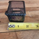 This glass jewelry box is elegantly handcrafted and designed to hold your most prized trinkets and jewelry. Carefully crafted using colorful stained and textured glass. Lead free solder. Metal / glass 1.5''H x 2.25''W x 1.75''D Imported