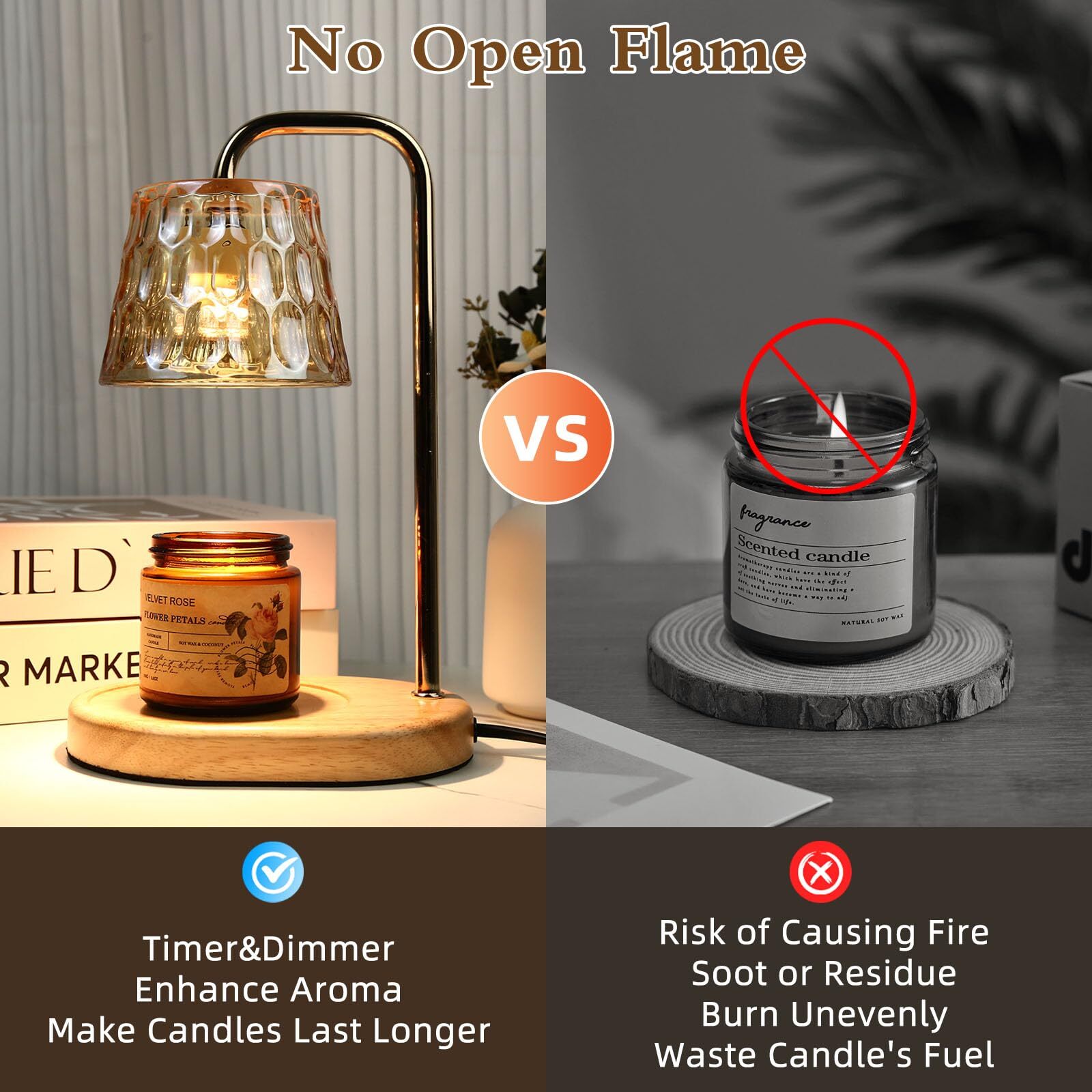 [Excellent Work Functional ]: Our electric candle warmer lamp with timer utilizes 35-watt halogen warming bulbs (included), gently melting the candle from the top down to bottom. With no open flame, no need concerns of flame, smoke, soot, and pollution, the candle warmer is good to people and environment. Moreover, no-slip pads have been added under the wooden base for stability, making you feel safe when using this candle lamp warmer. The candle lamp center groove circle diameter is 3.94inches(10cm) The height between the groove bottom and the glass is 4.9inches. [ Dimmer Brightness Adjustment ]:This candle warmer with timer with dimmable function controls the wax melting speed, Higher brightness melts wax faster, while lower brightness slows it down. The brighter the light, the stronger the scent, the darker the light, the lighter the scent, It will warm the candle in a minute, which makes candles last longer and helps save your money. [2/4/8H Timer Function]: The Candle Warmer Lamp with timer offers 3 different timer (2h, 4h, 8h),you won't need to worry about over heating the candle anymore. The candle warmer will automatically stop the luminosity at the time, and will stop burning the candle. The timer function allows you to sleep with peace of mind. [Cost-Effective & Cozy & Peace for many Occasions]: Candle warmer lamps with timer help you save money. They offer longer-lasting fragrances compared to traditional candles. The wax melts slowly and consistently, providing a continuous scent release over a longer period.This candle warming lamp create a calm and tranquil environment for yoga, sleeping or meditation, enhance your focus on studying or working, contribute to a romantic and pleasant dining experience and more, enjoy precious moment of life. [Best Festival Presents ]: The wax melt Warmer with beautiful glass lampshade will be the best presents for mom choice to show your love to your families, lover, or friends on Valentine's Day, Thanksgiving, Christmas, New Year, Housewarming or other special occasions. Birthday presents for women, birthday presents for men.