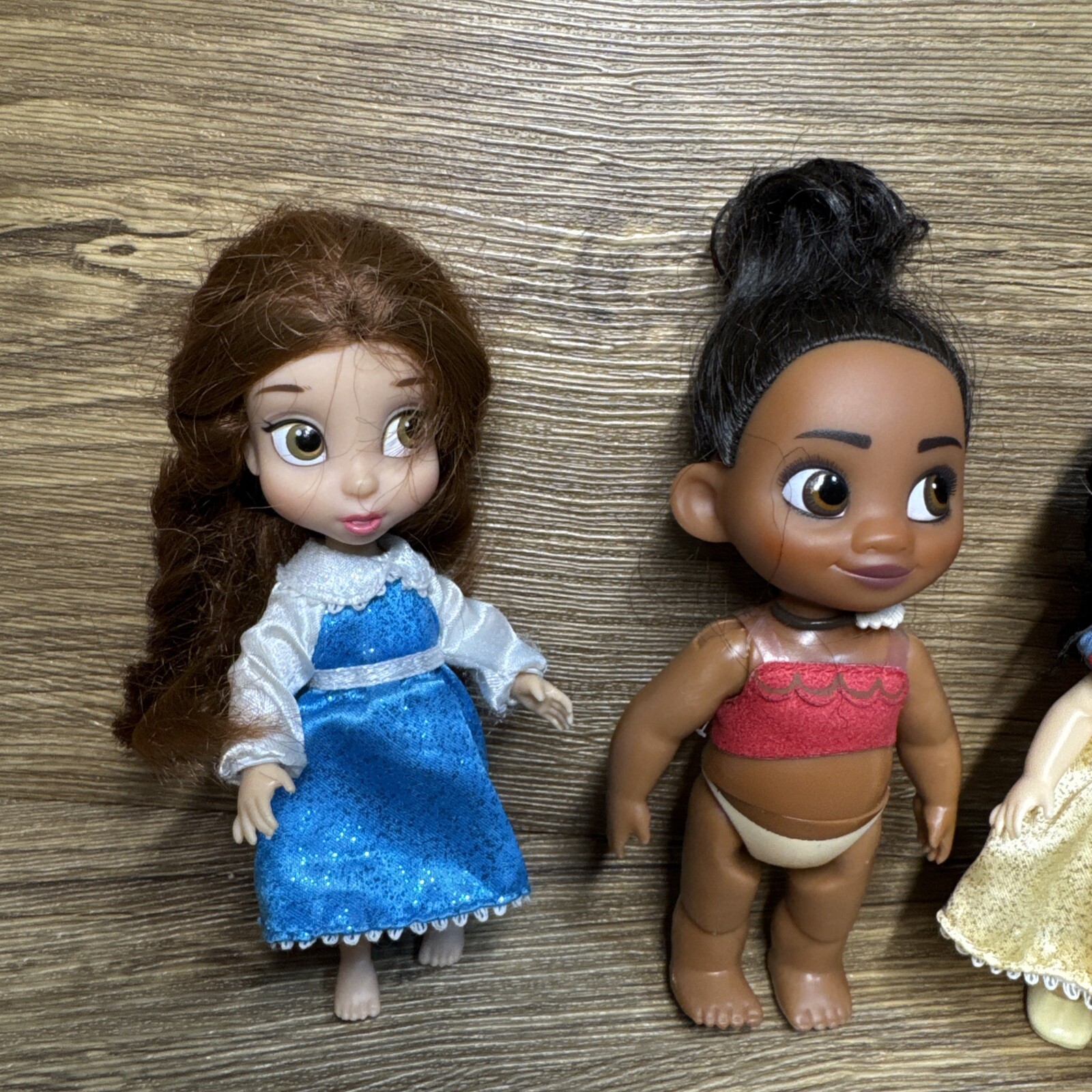 This Disney Store Animators Collection Mini Dolls Play Set Figure Princess Lot 4 is a must-have for any Disney fan. The set includes four figures of popular Disney princesses - Belle, Snow White, Moana, and another character - with varying hair colors and eye colors. The dolls are 5 inches tall and made of plastic, and the set comes with a custom bundle of four pieces. The set is an original and licensed reproduction by Disney, with characters from the Disney Princesses franchise. It is recommended for ages 5 and up, and is perfect for imaginative play and collection. The packaging is not included, but the set is a great addition to any Disney collection.