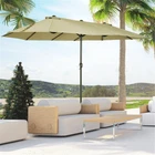 Features: 15' double-sided canopy keeps shaded area on any balcony, terrace, garden market or others Large 8.85' diameter double canopy umbrella with 8' height for wide coverage from the sun Superior strength and durability with the rust-resistant steel pole and 12 steel ribs Water resistant and anti-UV polyester canopy you from harmful elements 12 Ribs to support the canopy for stability and durability Solid crank handle lift system for smooth and easy opening and closing Easy to match any villa, garden, courtyard, swimming pool, plaza and more Stand is not included Specification: Color: Tan Materials: Steel, Polyester Overall Dimensions: 15' L x 8.85' W x 7.9' H Single Canopy Diameter: 8.85' Central Pole Dia: 1.9" 1 x Double-Sided Market Umbrella