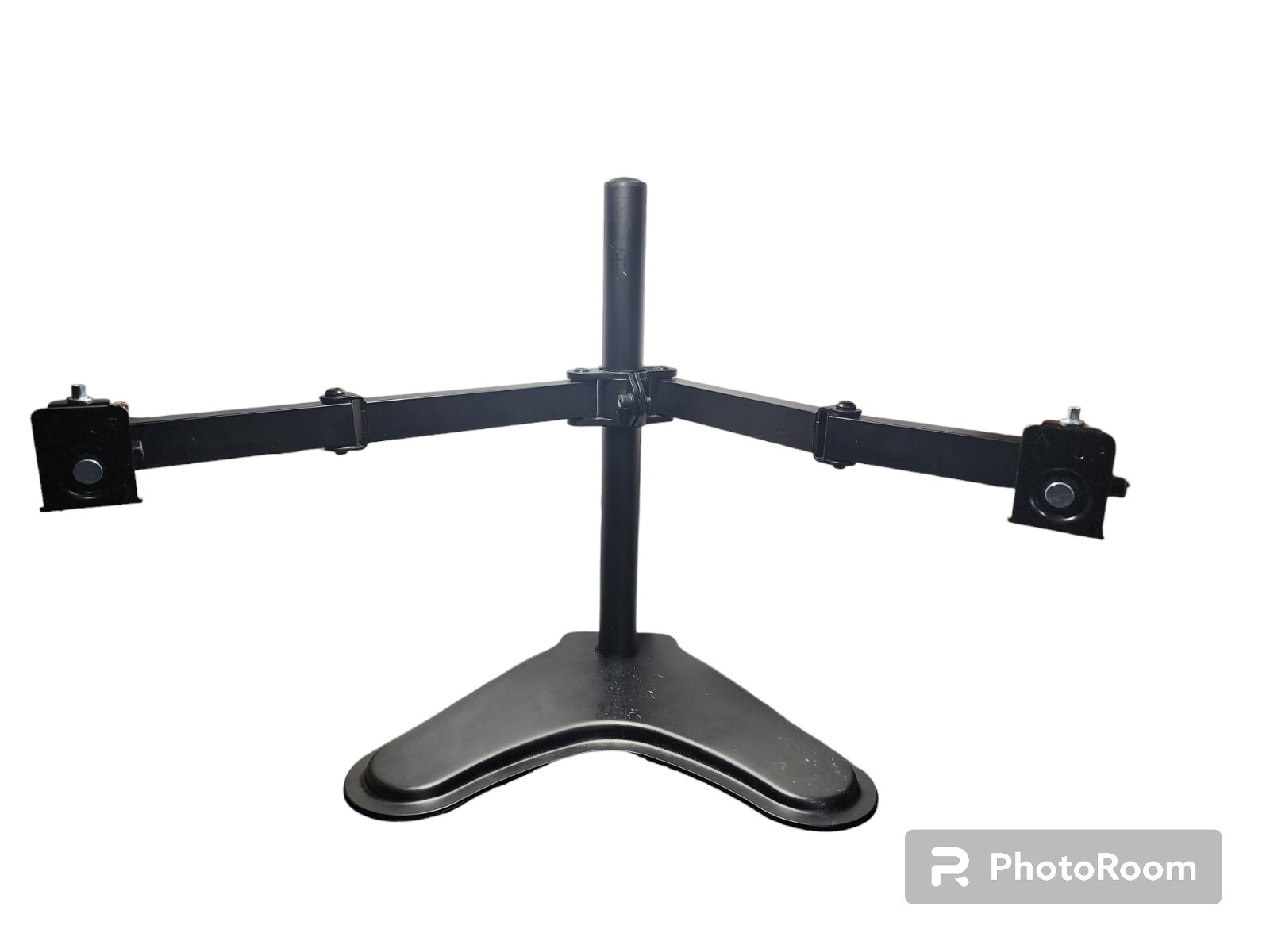 Enhance your workspace with this dual monitor desk stand in sleek black color. Designed to accommodate two monitors, this stand is perfect for those who require a multitasking setup. The stand is compatible with monitors up to 30 in It offers easy adjustment options that allow you to tilt and rotate your monitors for a more comfortable viewing experience. This stand is made by HuaNuo, a trusted brand in the market. Upgrade your desk with this reliable and sturdy stand and enjoy the benefits of a more organized workspace. This is a USED product. It has usage scratches on the stand, and it will be shipped on a regular box. Not original box.