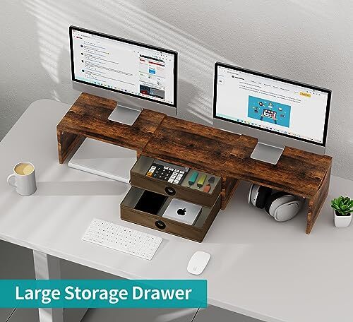 Return Policy Fast Delivery Trusted seller Dual Monitor Stand Riser with 2 Drawers, Wood Monitor Riser for 2 Monitors, Length and Angle Adjustable Monitor Stand with Storage, Desktop Organizer Stand for Computer,Laptop,Printer Product Description Keep Your Desk Organized: Our desktop stand with 2 drawers is perfect for storing office supplies like pens, calculators, staplers, and post-it notes,keeping your desk organized and clutter-free. Customize Your Setup: Comes in three separate units that can be adjusted to any angle or position you need. The length of the monitor stand ranges from 28.3’’ to 40.6’’. Maximize Your Workspace: Designed to accommodate multiple devices, including PC monitors, laptops, printers, and fax machines. With space for 2-3 monitors/laptops, you can work more efficiently. Sturdy and Stable: With a weight capacity of 132lbs(each shelf 44lbs), this monitor riser can support a variety of heavy machines and can be used as a desk shelf for your books and other items. Ergonomic Height: Improve your posture and reduce eye strain with our monitor stand riser, which raises your computer screen to 7.4’’ high and provides a better viewing experience. Shipping Returns Payment Shipping Shipping is FREE to all addresses other than APO/PO boxes in the lower 48 states. All our stock ships from US-based warehouses. Shipped via USPS or UPS (depending on location and package weight) Unless stated otherwise, all orders will ship within 24-72 hours of your payment being processed. Check our feedback to see the great reviews of FAST shipping we offer. Returns Seller does not accept returns Payment We currently accept payment via eBay managed payments only. Once payment is cleared, we will dispatch your shipment within 1-3 business days. Please refer to the "Shipping" tab for more information regarding shipping speed to your destination.