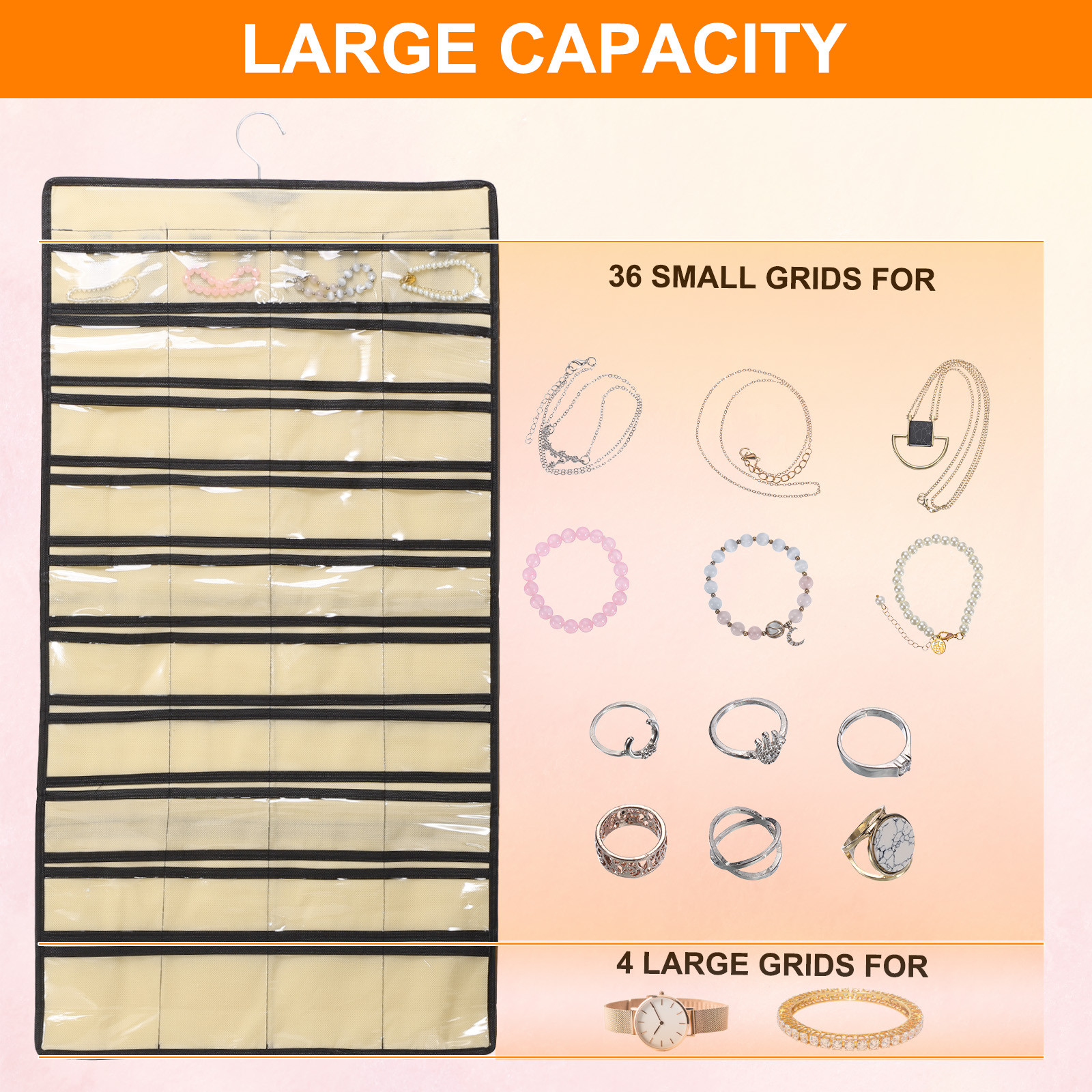 Dual-Sided Beige Jewelry Organizer with 48 Pockets and 8 Hook Loops