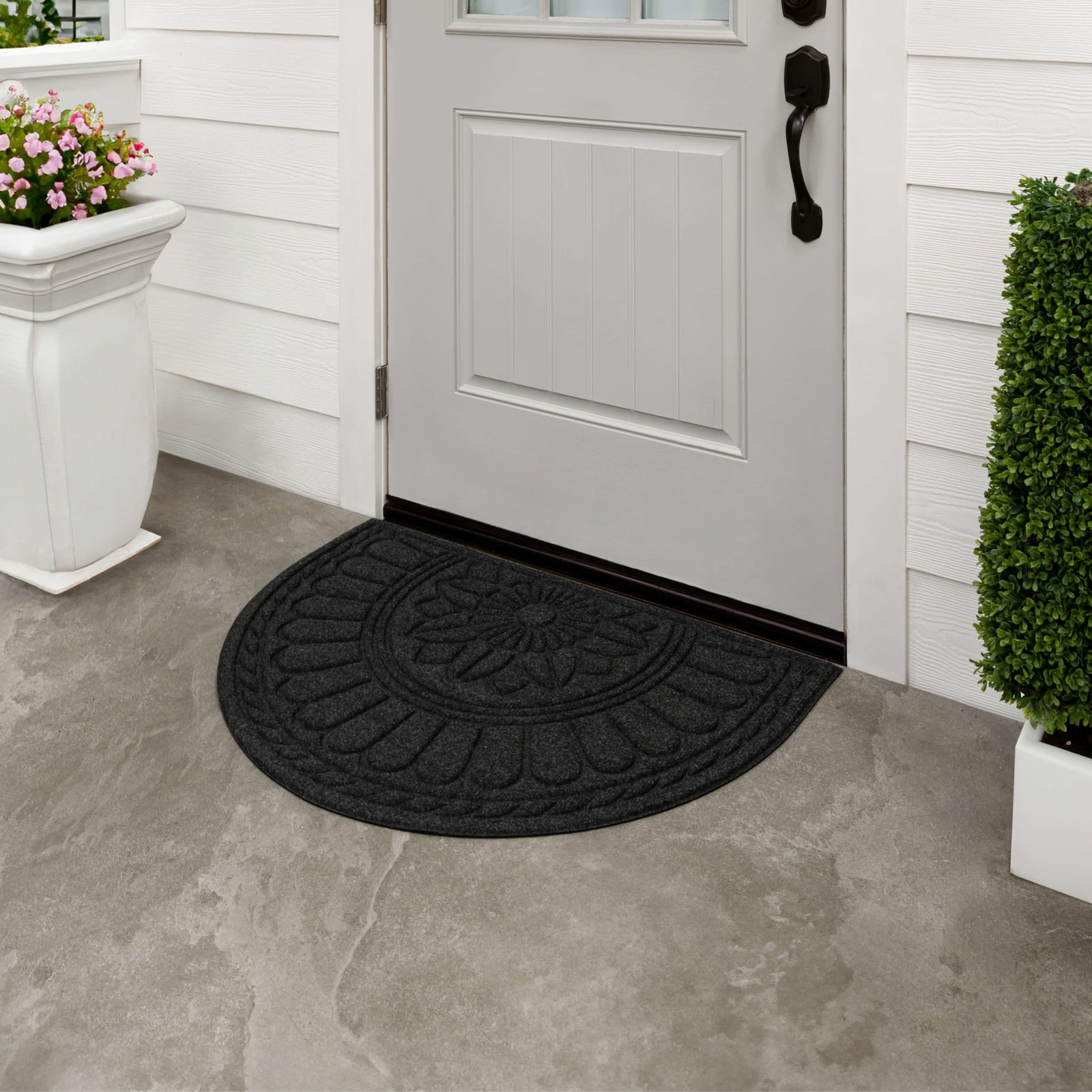 Welcome your guests with the inviting charm of this stylish door mat from , showcasing a functional high/low design in rich color that complements any entryway. Perfect for both indoor and outdoor use, this resilient doormat ensures enduring durability in high-traffic areas and spaces exposed to the elements. Crafted from resilient polyester surface fiber and backed with 100% recycled rubber, this doormat presents an environmentally conscious decor option that is more stylish than ever! The textured polyester surface fiber provides secure traction in all weather conditions, effectively absorbs excess water, and helps remove dirt from shoes before it is tracked indoors. Explore a variety of stylish designs and sizes to bring functional flair to any entryway in your home. DYNAMIC DESIGN: Innovative grooved surface design effectively removes debris from shoes, traps dirt, and channels excess water away before it is brought indoors. EXTRA GRIP: Robust rubber backing provides extra grip to help minimize doormat slipping and sliding on hard surface flooring in high traffic entryways. LOW PROFILE: Low-profile height ensures optimal functionality for any doorway by reducing tripping hazards and entryway obstructions, while allowing doors to open and close freely. EASY CARE & CLEAN: Keep your doormat looking fresh with ease: simply vacuum, sweep, shake out, or rinse off debris with a garden hose, and spot clean when needed; air dry flat. MADE IN THE USA: Proudly made in the USA of U.S. and imported polyester material and recycled rubber ensuring a top-tier sustainable option for every setting.
