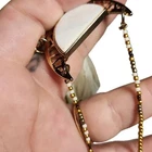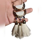 This is a pretty summer necklace in gold & white colors. It has a large, fringe tassel with some faux pearlized inlay and gold tone hardware. There are small gold and white seed beads strung on the 32" cord.