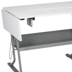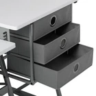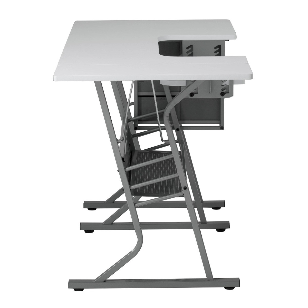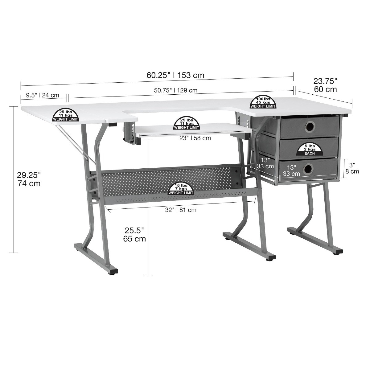 The Eclipse Ultra Sewing Table features a large 60.25-inch/ 153.04cm wide tabletop that allows you to spread out, cut or adjust fabric and patterns. The 9.5-inch/ 24.13cm wide side shelf folds down if less space is needed when not in use. The three fabric storage drawers and a large lower shelf are available, so you can organize your supplies and keep them close. The unique platform shelf lowers and allows you to adjust for a variety of sewing machine base heights. The heavy gauge steel construction thick top makes it a durable table for years of use. It can also be used with a computer or for extra workspace in any room.
