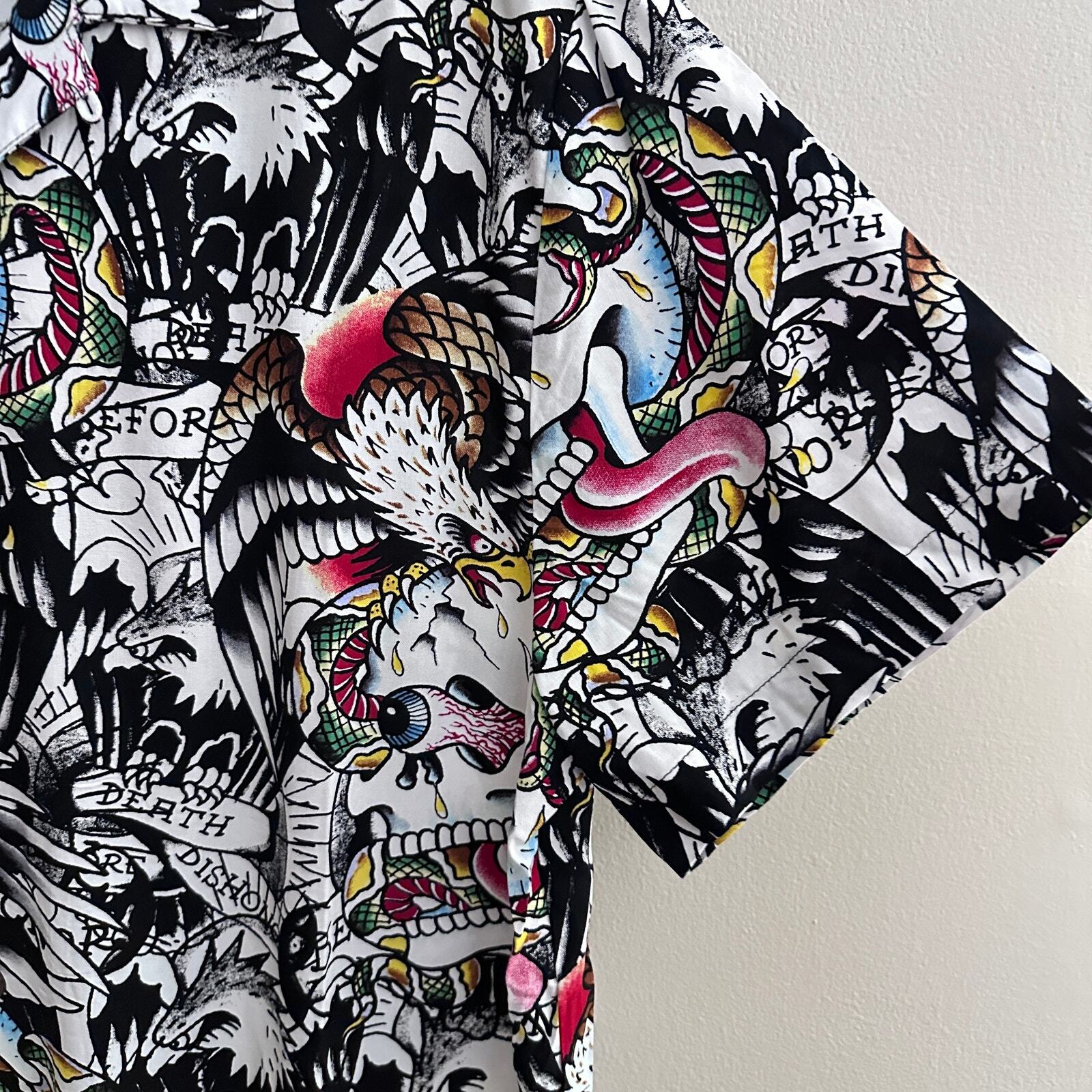 Ed Hardy Battle Skull Tattoo Art Print Camp Shirt Button Up Mens LARGE Short Sleeve. Size: LARGE Approx. measurements: 22" across (pit to pit), 30" long (shoulder to hem) Condition: Pre-loved and in gently used condition. Light wear. no stains, rips, or holes. - see all pics for any wear/condition Actual colors may vary. We do our best to ensure that our photos are as true to color as possible. However, due to photographic lighting sources, inconsistencies of various monitors settings, we cannot guarantee that the color you see accurately portrays the true color of the product. tattoo, skater, casual, skateboard, retro, y2k