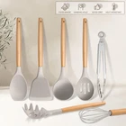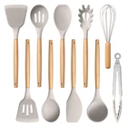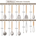 FOOD GRADE & HEAT RESISTANT SILICONE- Made of food-grade silicone that is healthy and heat resistant up to 446°F, Good abrasion, odor and high temperature resistance, No worry about burning, melting or toxic substance releasing to your food in the heat, Stand up to the wear and tear of daily use HEAT INSULATION WOOD HANDLE- High-hardness natural wooden handle built to last, Have good insulation performance make it stay cool to the touch during high-heat cooking, With lightweight provide secure and comfortable grip, Hanging hole easy for handing up to keep kitchen tidy NON-STICK & EASY CLEAN- Nonstick silicone coating good anti-sticking and stain resistance, Ensure that food slides effortlessly off the utensils, Reducing the need for cooking oil to make cooking and cleanup a breeze, Recommend washing by hand to extend serving life HEALTHY FOR NONSTICK COOKWARE- Flexible silicone head soft and safe for the nonstick or ceramic pots and pans, Also strong enough to scratch around the corners and edges to wipe off any residue, Without scratching or damaging the surface to prolong the serving life of your cookware 10-PIECE KHAKI SILICONE UTENSILS- Contains Soup ladle, Spatula Turner, Slotted turner, Large spatula, Pasta Server, Slotted spoon, Solid spoon, Round spatula,Kitchen tongs and Egg whisk, The range of utensils covers all your cooking needs, From stirring to flipping and serving, Ideal gift