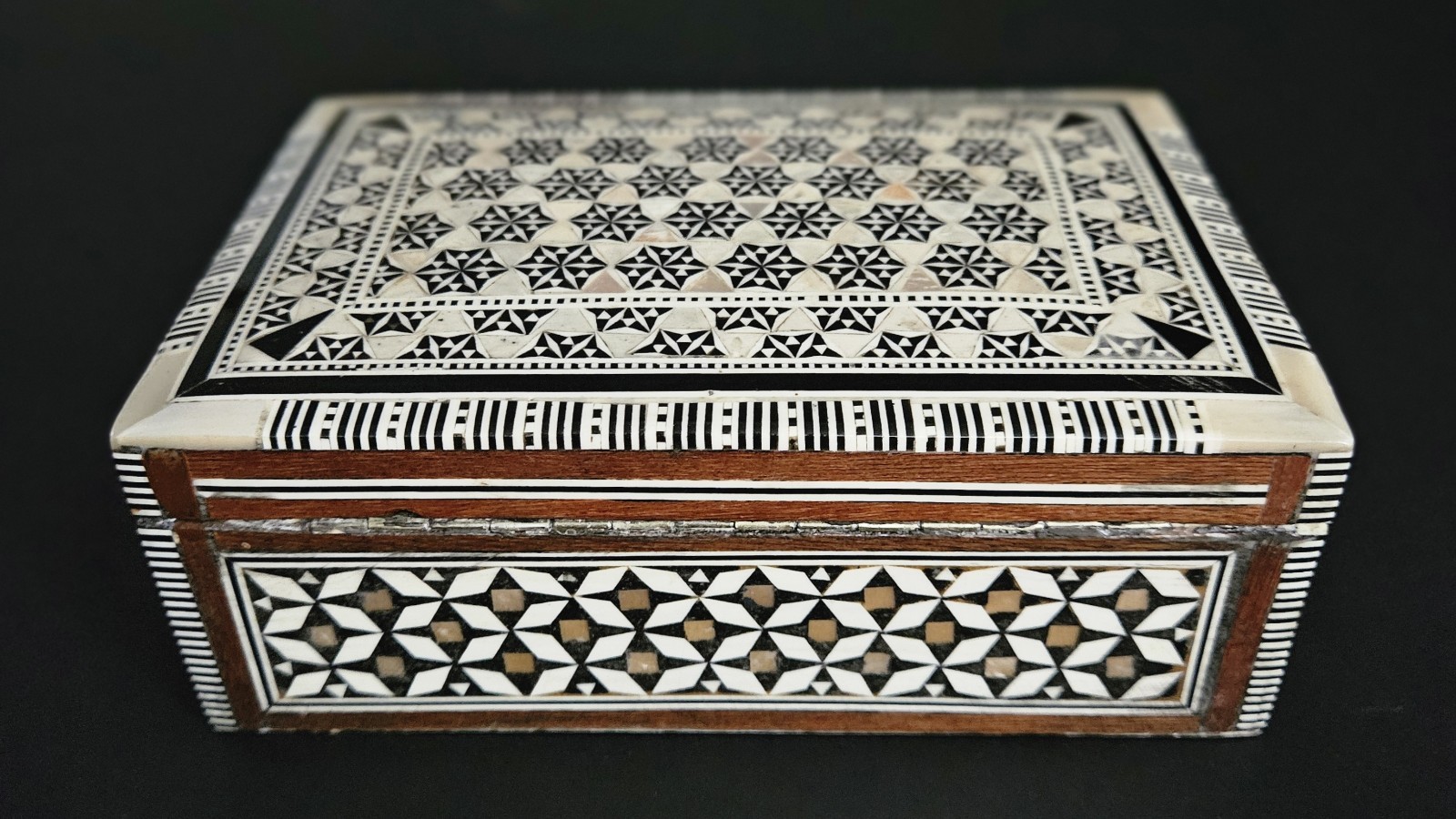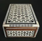 Vintage Egyptian mosaic inlaid mother of pearl & wood lined jewelry trinket box. 5.5"W x 2"H x 3 5/8"D. Excellent condition.