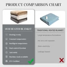FOR WHOM: Couples with large temperature difference in sleeping quilts; The elderly and students whose quilts are always not hot when sleeping; It is not only suitable for bed use when sleeping, but also can be used on the sofa or balcony when family gathering, or even when camping; heated blanket brings you warmth UPGRADE HEATED BLANKET: It's outstanding features, luxurious double-layer flannel finish - Anti-static, Anti-pill- No skin dryness after use - all of which contribute to a peaceful, warm and cosy night's sleep all year round for years FUNCTIONALITY: This premium electric blanket with the ETL certified. With illuminated dual independent controls, 10 heat settings (89-108°F), 0.5-12 hours timer settings (Default 10 hours) for both side, you can use your heated blanket in all seasons and tailor the heat and timer settings to suit you EASY CARE: Our heated blanket is machine washable in cold water (40°C) to save your time and energy. Under treated with a special process, you will never worry about blanket's fabric shedding everwhere or shrink after washing. Neat stitches and edge-wrapping enhance strong connections at seams , make the blanket more durable for long use TRUST YOUR CHOICE:1* Queen size heated electric blanket, bring you additional warm and comfort experience whether you rest in the bed, nap on the sofa or outside camping picnic. So don't wait any longer, just own it right away. If you have any questions regarding the product or service, please feel free to contact us, we have 5 YEARS GUARRANT