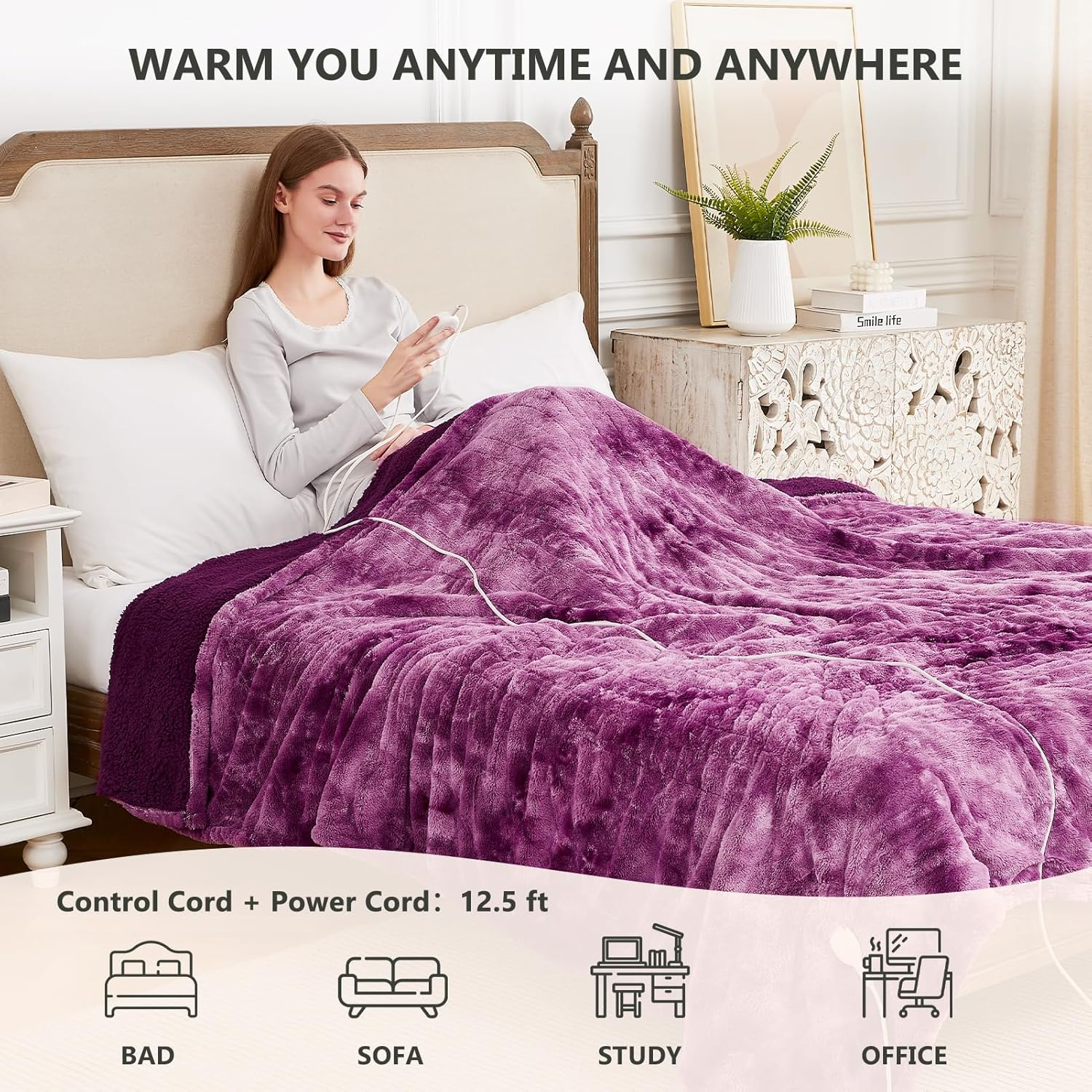Store New Arrivals Add to Favorite View Feedback Contact Heated Blanket Electric Twin - 62X84 Heating Blanket Twin 5 Gears Auto-Off 10 Heat Levels Heat Blanket Over-Heat Protection Luxury Faux Fur Sherpa Heater Blanket Electric ETL Certification Description Item model number YZH-6284B Style Contemporary Number of Items 1 Pattern Solid Blanket Form Throw Blanket Theme Heated blanket Batteries required No Product Dimensions 62"L x 84"W Material 200gsm Flannel + 200gsm Sherpa Model Name YZH-6284B Seasons Winter Age Range (Description) Adult Water Resistance Level Not Water Resistant Fabric Type 200gsm Flannel + 200gsm Sherpa Item Weight 5.41 pounds Fill Material Faux Fur, Sherpa Special Feature Corded Fabric Warmth Description Heavyweight Color Purple Recommended Uses For Product Reading, Napping, Working Refill Faux Fur, Sherpa Included Components Controller Product Care Instructions Hand Wash, Machine Wash Size 62"x84" 200gsm Flannel + 200gsm Sherpa Premium Material: 380gsm Faux Fur + 220gsm sherpa. The fabric is very soft, thicker than normal blankets, and warmer than normal blankets even without electricity. The fabric is durable and does not shed. The diameter of the heating wire is 2.2 mm, and the existence of the heating wire is hardly felt during use, which is more comfortable Safety: Homemate heated blankets have passed the American safety UL964 Test. Have ETL Certification.Lower Electro Magnetic Radiation.The heating wire is designed and produced by Japanese company,more advanced technology,stronger insulation and flame resistance.Moreover,the heating blanket use NTC overheating protection technology to ensure that it will not overheat and cause burning. And our heating wire is longer, so the heating area is larger and the heat is more evenly distributed Eenergy Saving: Homemate heated throw blanket use the intelligent temperature adjustment technology. When the temperature rises, the portable heated blanket will automatically adjust the temperature according to the surrounding environment, which can always provide users with a comfortable feeling and is conducive to energy saving. Compared with air conditioner,using Homemate heated blanket is more energy efficient, and you can save more heating costs in winter Eesy to Use: Homemate heated blanket have 10 heat levels, 1h 2h 4h 6h 8h auto shut off. Temperature range is 86-122°F. There is only one button on the controller to control the temperature, very convenient to use, even the elderly, the sick, and the disabled can use it easily. Power cord is 16.7ft, this long cord makes the use of the warm blanket more flexible, can be used on the bed, on the sofa, can be used in the study and office, very convenient Notice: Homemate heated blanket is the best gift for birthday or other holiday like Christmas, New Year's Day. Electric blanket full size can be machine washed, but please read the instructions carefully before cleaning to avoid improper operation, which can avoid safety problems and prolong the service life of electric throw blankets. Product Description The video showcases the product in use. The video guides you through product setup. The video compares multiple products. The video shows the product being unpacked. ABOUT US We offer the best prices around on high quality products. Our E-store includes media such as books, movies, music and games while offering electronics, toys, sporting apparel, clothing, tools, general home, garden items and more. SHIPPING We are always working hard to ensure your package arrives as soon as possible. Please understand that some factors like weather, high postal traffic, and the performance of shipping companies are outside of our control. We offer free shipping to the lower 48 states and ship within 2 business days of payment, usually sooner. We do not accept P.O. Boxes. Please provide a physical address. For shipping outside of the continental USA, we only use eBay's Global Shipping Program.The item is shipped to KY and then sent to the rest of the world. International customers are responsible for all duties and taxes. Continue to check out in order to calculate costs for shipping the item to your country. Messages regarding eBay's Global Shipping Program MUST be directed at eBay EXCLUSIVELY. RETURNS We offer a 30-Day Return Policy on items which you are not completely satisfied with. You have the option for a full-refund or an exchange of the item. No returns are available on items shipped outside of the USA. PAYMENT We accept PayPal. CONTACT US This page content is yet to come Please ad us to your favorite seller and visit again later Thank You CUSTOMER SATISFACTION We try our very best to make sure every customer is completely satisfied. If there's a problem, message us! We're happy to help.