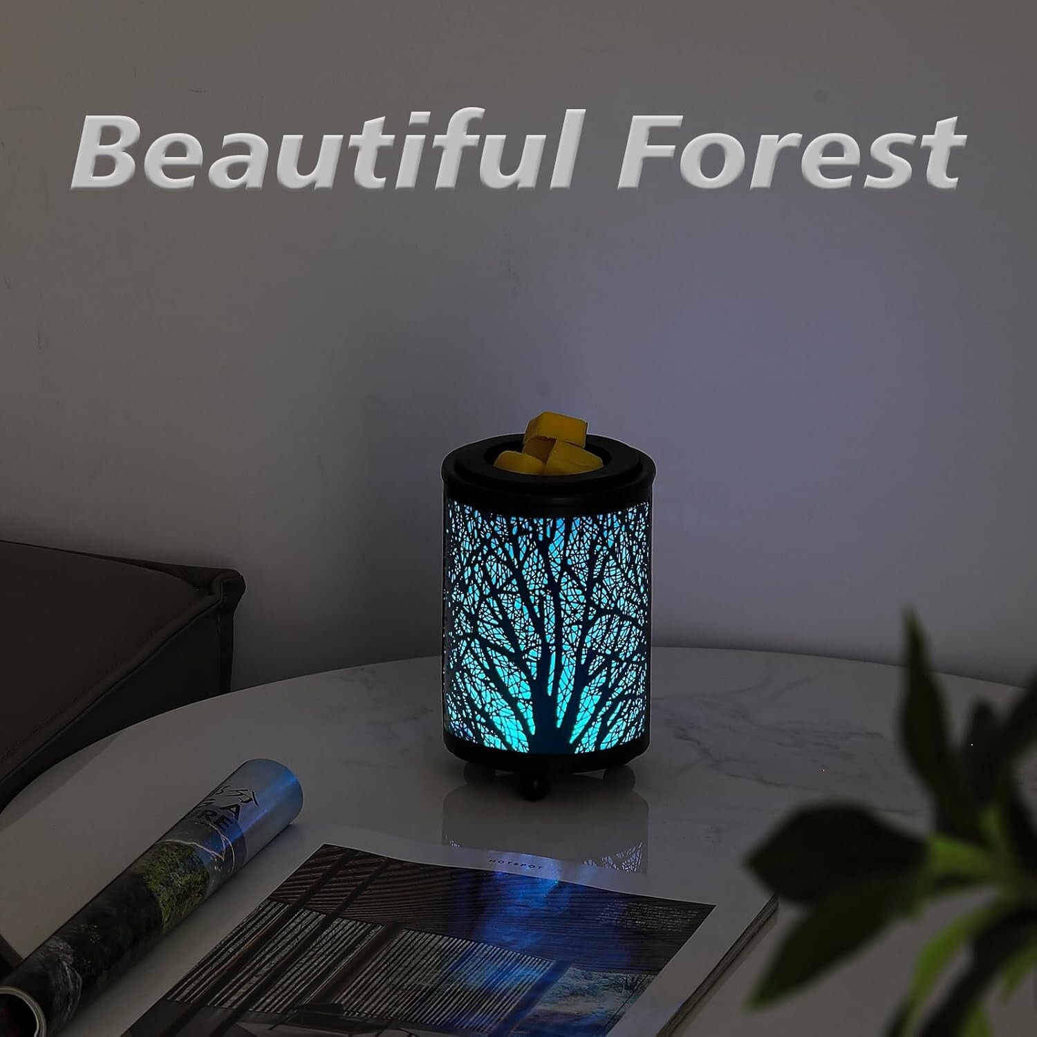 Unique Forest Design: The wrought iron Wax Melt Warmer features an exquisite forest design, bringing a blend of nature and art to your space, creating a warm and inviting atmosphere. Convenient Cleaning: With a cleverly designed detachable silicone wax tray, cleaning wax residue becomes effortless, saving you time and effort. Keep your Warmer tidy and hygienic without the hassle of cleaning. Advanced PTC Heating: Utilizing advanced PTC heating technology eliminates the need for traditional light bulbs, solving the problem of frequent replacements. This ensures a longer lifespan and provides a consistent and stable warmth experience. Smart Temperature Control: The intelligent constant temperature design requires no manual adjustment, ensuring you always enjoy the perfect warmth. All of this is achieved in an environment free from open flames, smoke, and pollution, ensuring fresh air in your living space. Rich Lighting Experience: Equipped with a built-in seven-color LED night light, you can choose a fixed color or enjoy automatic color changes, creating a unique ambiance. Whether setting a romantic mood or adding a splash of color to your space, it caters to your diverse needs.
