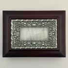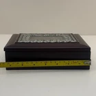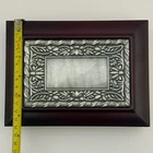 Wooden Jewelry Box with Floral Metal Inlay – 7.5 x 5.5 x 2 inches. Pre-owned item in good condition. The wooden box shows some scratches on the bottom from previous use, but the exterior and floral metal inlay are well-maintained. The velvet interior remains in good condition. Ideal for storing jewelry or trinkets, this box is both functional and stylish. Please refer to the photos for a closer look at its condition. The pictures are of the exact item you will receive. Please check the photos for more details. Please note that this item might have a slight smell of smoke due to storage and the cardboard box used for shipping. We take great care in cleaning and carefully packing the item to minimize any potential odors. Additionally, we prioritize fast shipping to ensure the item arrives quickly and in excellent condition. If you have any concerns, feel free to contact us before purchasing. Thank you for your understanding!