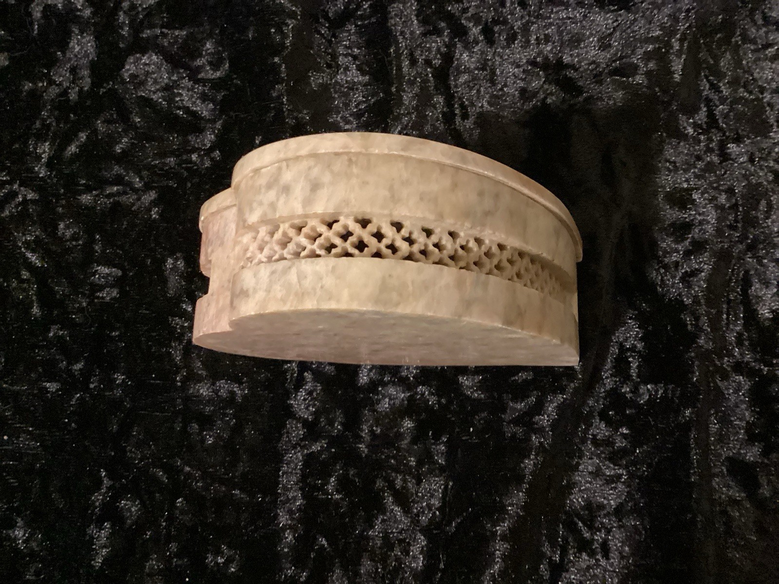 The Heart Marble Look Trinket Jewelry Box is a beautifully crafted piece that features a delicate flower design within a heart-shaped box. Made from marble like soapstone and adorned with mother of pearl accents, this jewelry box exudes elegance and sophistication. adds a touch of luxury to this decorative collectible, making it a perfect addition to any collection or as a unique gift for a loved one. The intricate details and high-quality materials make this trinket box a stunning and functional piece for storing cherished items. Measures: 4” x 3-1/2” Detailed lace look on sides.