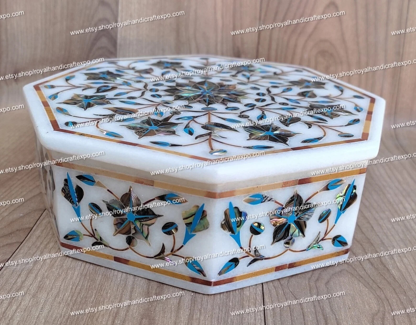 This stunning marble jewelry box is a masterpiece of traditional Pietradura craftsmanship, just like the intricate work seen in the Taj Mahal! The hand-cut semi-precious stone inlays create a dazzling floral or geometric pattern, each piece carefully fitted into the marble for a flawless finish. It's not just a jewelry box—it's a piece of history and art, perfect for adding elegance to any home. The attention to detail is incredible, making it a true heirloom. Highly recommended for anyone who appreciates fine craftsmanship!