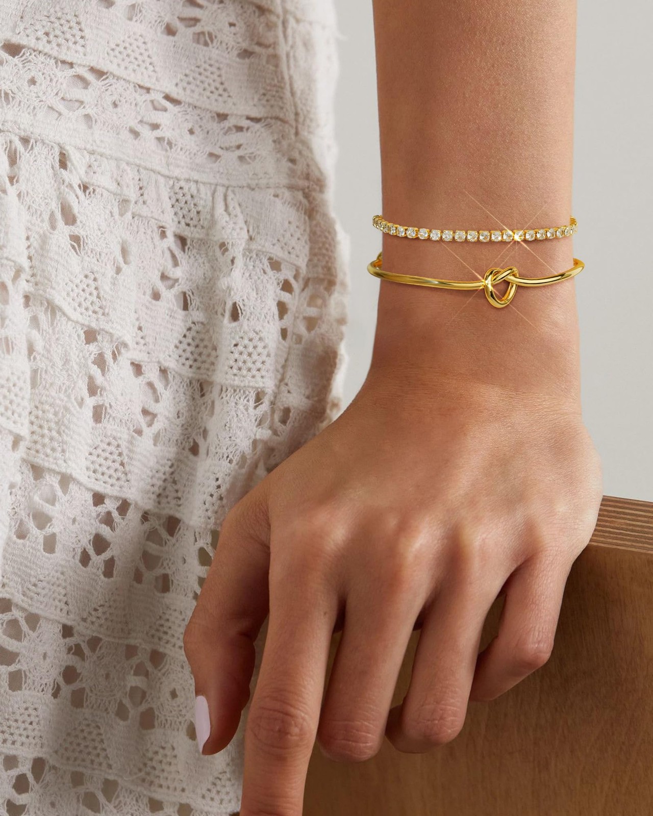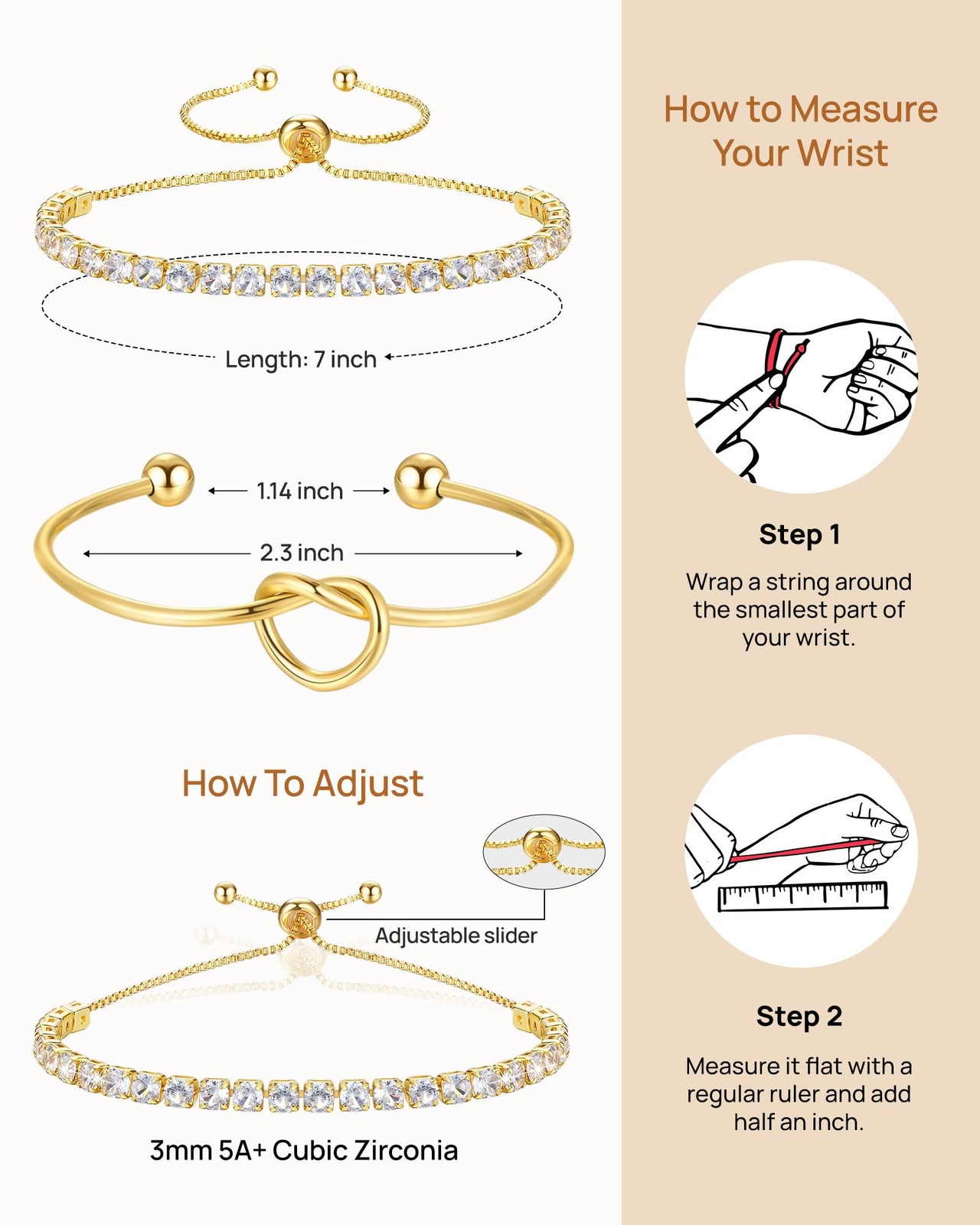 Gold Bracelets for Women Gold Bangles for Women Stackable Tennis Bracelets Gold Cuff Bracelets Cubic Zirconia 14K Gold Plated Forever Love Knot Infinity Bracelets Jewelry Gifts for Women Product Features: [Gold Bracelet Stack]: gold bracelet set come with one gold forever love knot infinity bracelets and one tennis bracelets, gold tennis bracelet have adjustable slider, adjustable up to 9.5 inches, each gold bracelets can be worn separately or together for a layered look. [Elegant Tennis Bracelet]: These gold bangles are made of premium quality with 14K real gold plating that won't fade easily. The gold tennis bracelets are plated with 14K real gold to ensure a lasting shining finish, it features 3mm AAA+ cubic zirconia set in four-prong basket setting to prevent the stones from falling out. Hypoallergenic for sensitive skin. [Gold Cuff Bracelets for Women]: Infinity love knot bracelets bangle is adjustable, fits small to large wrist. A firm bend can adjust to size.The sparkle of gemstones and real gold plating will illuminate your wrist, It will look gorgeous when you wear this bracelet with your beautiful outfit on normal days or special occasions. [Gift for Her]: gold bangle bracelets come with a pretty brand pouch and ready for gift giving. It's a perfect gift for women, girlfriend, sister, friends, mom, someone special or yourself on Mother's Day, Valentine's Day, Birthday, Wedding, Engagement, Christmas and Thanksgiving. on , double surprise for you. And please feel free to contact us if you have any questions about our gold bangles and tennis bracelets, we'll solve it within 24 hours.