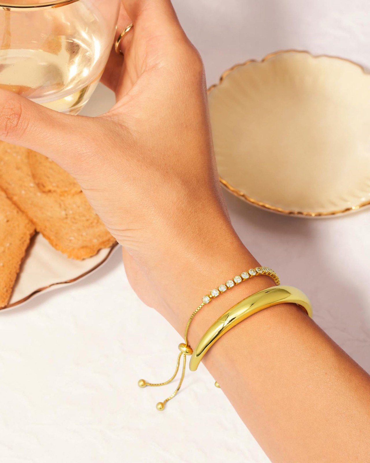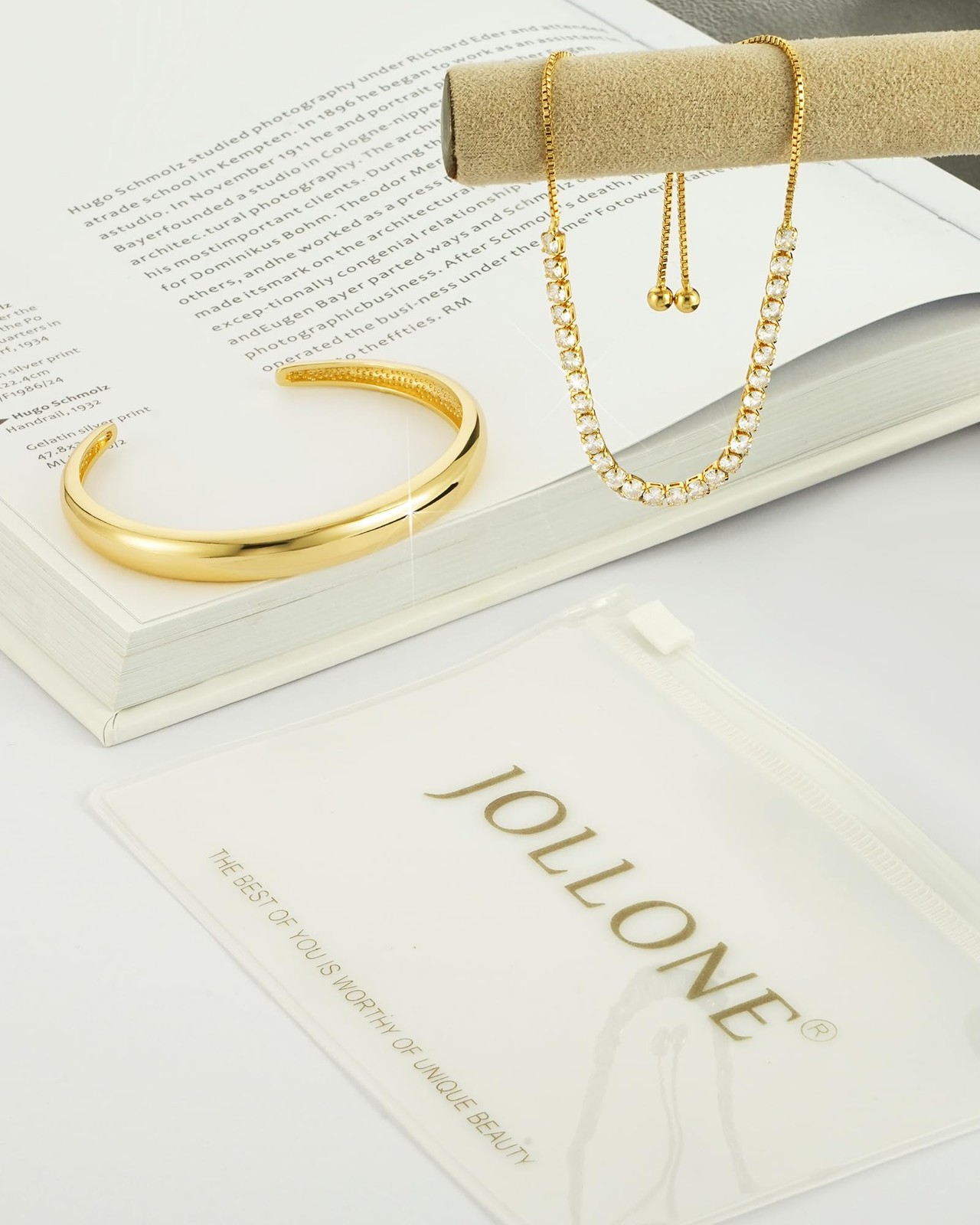 Gold Bracelets for Women Gold Bangles for Women Stackable Tennis Bracelets Gold Cuff Bracelets Cubic Zirconia 14K Gold Plated Chunky Gold Cuff Bracelets Jewelry Gifts for Women Product Features: [Gold Bracelet Stack]: gold bracelet set come with one chunky gold cuff bracelets and one tennis bracelets, gold tennis bracelet have adjustable slider, adjustable up to 9.5 inches, each gold bracelets can be worn separately or together for a layered look. [Elegant Tennis Bracelet]: These gold bangles are made of premium quality with 14K real gold plating that won't fade easily. The gold tennis bracelets are plated with 14K real gold to ensure a lasting shining finish, it features 3mm AAA+ cubic zirconia set in four-prong basket setting to prevent the stones from falling out. Hypoallergenic for sensitive skin. [Gold Cuff Bracelets for Women]: Chunky gold cuff bracelet is adjustable, fits small to large wrist. A firm bend can adjust to size.The sparkle of gemstones and real gold plating will illuminate your wrist, It will look gorgeous when you wear this bracelet with your beautiful outfit on normal days or special occasions. [Gift for Her]: gold bangle bracelets come with a pretty brand pouch and ready for gift giving. It's a perfect gift for women, girlfriend, sister, friends, mom, someone special or yourself on Mother's Day, Valentine's Day, Birthday, Wedding, Engagement, Christmas and Thanksgiving. on , double surprise for you. And please feel free to contact us if you have any questions about our gold bangles and tennis bracelets, we'll solve it within 24 hours.