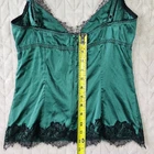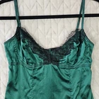 Beautiful emerald green silk camisole with black lace trim. Has a zipper closure on the back. Babydoll bust line with defined cups. Elastic around the top for the best fit! Embroidered style detail down the front to mimic the look of boning. Adjustable straps. In excellent pre owned condition, has one small spot that will come out with treatment.
