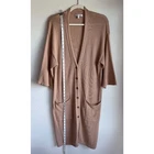 EUC - no stains, holes, or pilling. Small pull on the inside near the bottom, you don't notice it on the front (see photo). Overall in excellent condition. Lightweight knit cardigan sweater in a longer length. Relaxed fit. Deep v-neckline with button-front closure. Front pockets. Versatile camel color. 60% Cotton, 40% Rayon Sizing varies from brand to brand, please use measurements in photos to decide if this will fit. Unless otherwise specified, this is a preowned item with normal signs of wear. There is no notable damage or stains. Please see all photos for exact item condition. Wash to wear. Ships from a smoke-free home! Thanks for checking out my store! All items ordered before 10am PST ship same day. Orders received after 10am PST ship the next morning. Make a bundle to save on shipping costs.