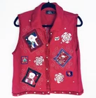 Christmas vest cardigan with gold buttons and embellished with embroidery, beading, snowflakes and stars. A cozy velvet like red trim is around arm holes, button placket, and hem. This sweater features "snapshots" of Santa, Snowman, and Rudolph. There are buttons on the inner collar to attach a fur collar - which is missing. Condition/Info: This is a pre-owned item. One of the snowflakes has edges lifting up and needs some fabric glue. Two of the tiny stars along the hemline are peeling. See last 3 photos before tag pictures. Detachable fur collar is missing. No holes, stains, or tears seen. View all pictures carefully as they are part of the description. Color in pictures may be different in person due to lighting. Size: PXL Color: Red Material: Cotton/Ramie blend Style: Sweat vest, cardigan. Boxy, short. Handwash MEASUREMENTS (approximate laying flat): Shoulder to shoulder: 16.5" Underarm to underarm: 20.5" / 41" circumference Hem opening: 21" / 42" circumference Length from bottom of collar to hem: 22" 🍄Thanks for looking! ⭐Smoke and pet-free ⭐Examine photos carefully as they are part of the description. ⭐Ships quickly - same or next business day! #Bling #Embellished #Uglychristmassweater #Christmasparty