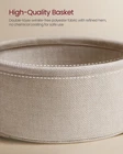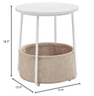 [Quick and Easy to Assemble] Thanks to the simple structure and clear instructions, this side table can be assembled in 5-10 minutes [Delights Small Spaces] The 17.7"Dia. x 19.7"H end table with 15.6"Dia. x 7.2"H basket fits perfectly in small spaces, occupying little space while offering ample storage. You can use it as a side table in the living room or a nightstand in the bedroom [Sturdy and Stable] The sturdy particleboard tabletop is fixed to the frame without wobbling. The one-piece U-shaped steel legs offer solid support. The adjustable feet increase the stability and don't scratch the floor [Quality Fabric Basket] The double-layered polyester fabric basket is visually appealing, crease-free, and free of chemicals, making it safe to use. Its linen-like appearance adds a touch of uniqueness to this round table [Modern and Simple] This simple matte white round coffee table with a camel brown basket will add an extra touch of style to your living room or bedroom and is easy to match with a variety of furniture styles. Design Patent Pending (Appl. No. US29/872,958)