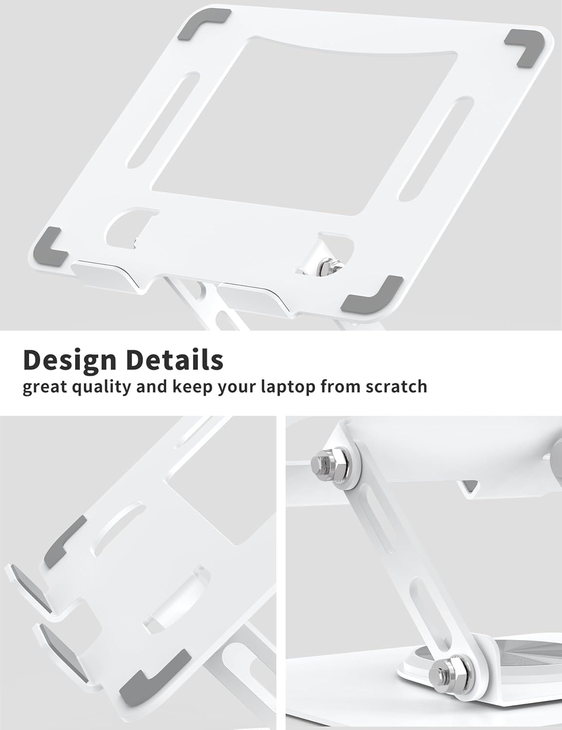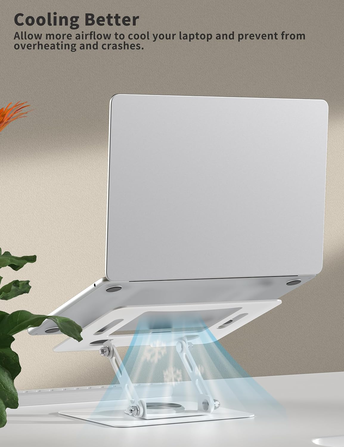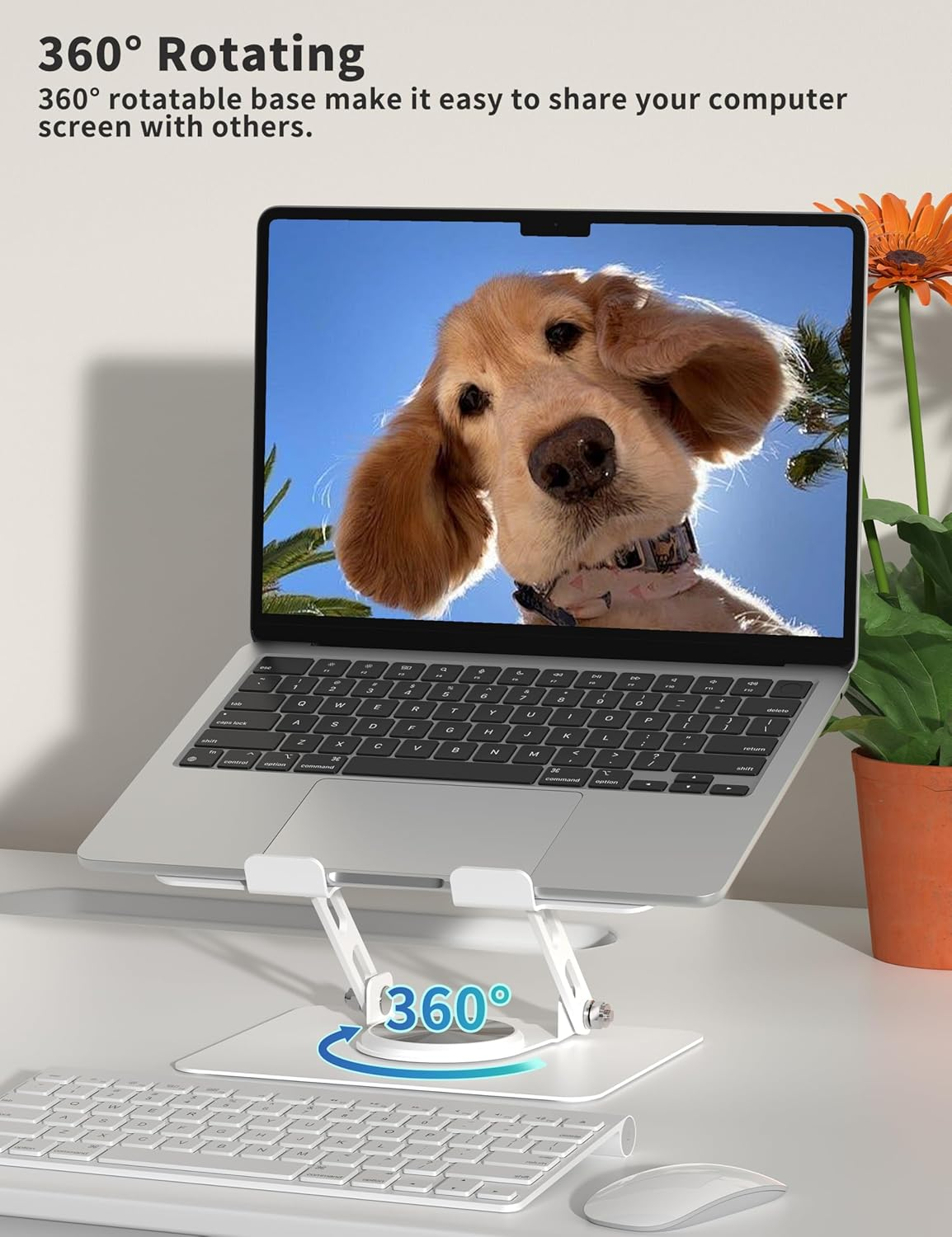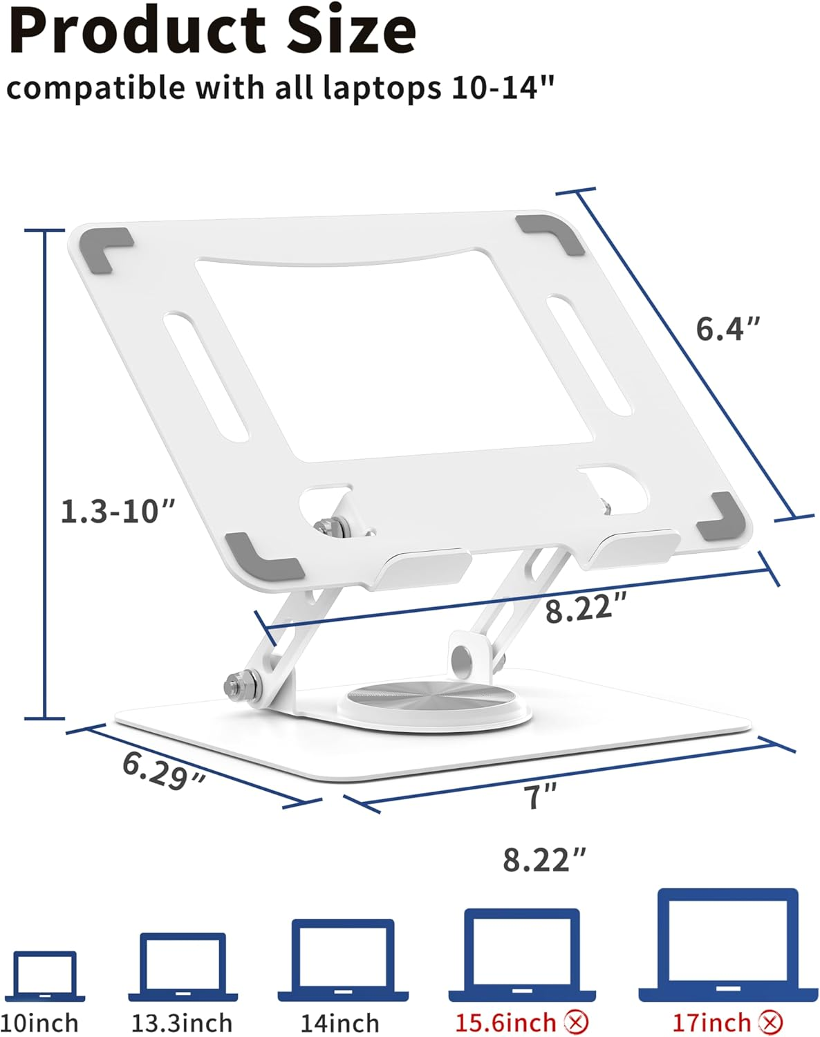 360° Rotation - Great for collaborate on a project. The laptop stand with rotabale base make it easy to share your computer screen with others. Heavy & Stable - Made of better quality metal material, the base of the laptop stand is heavier than normal laptop riser which is made of lightweight aluminum alloy. Highly Efficient Heat Dissipation - Boasting a hollow design, the ventilated notebook stand maximizes ventilation, preventing your notebook from overheating and helping it function efficiently. Adjustable & Foldable Design - Adjustability makes it more ergonomic, the computer stand promotes ergonomic working positions, relieving neck, shoulder, and eye strain. Moreover, its foldable design allows you to store it conveniently, decluttering your workspace. Suit for Laptops 10 to 14 Inches - Compatible with any laptop computers 10-14 inches. Great laptop accessory when you work at home or office, zoom calls, etc. Collaborative Working Great for collaborate on a project. The laptop stand with rotabale base make it easy to share your computer screen with others. Key Features: 1. Compatitable with 10-14 Inches Laptops; 2. Heavy & Stable; 3. Ergonomic Design; 4. Rubber Pads; 5. Zero-Assemble
