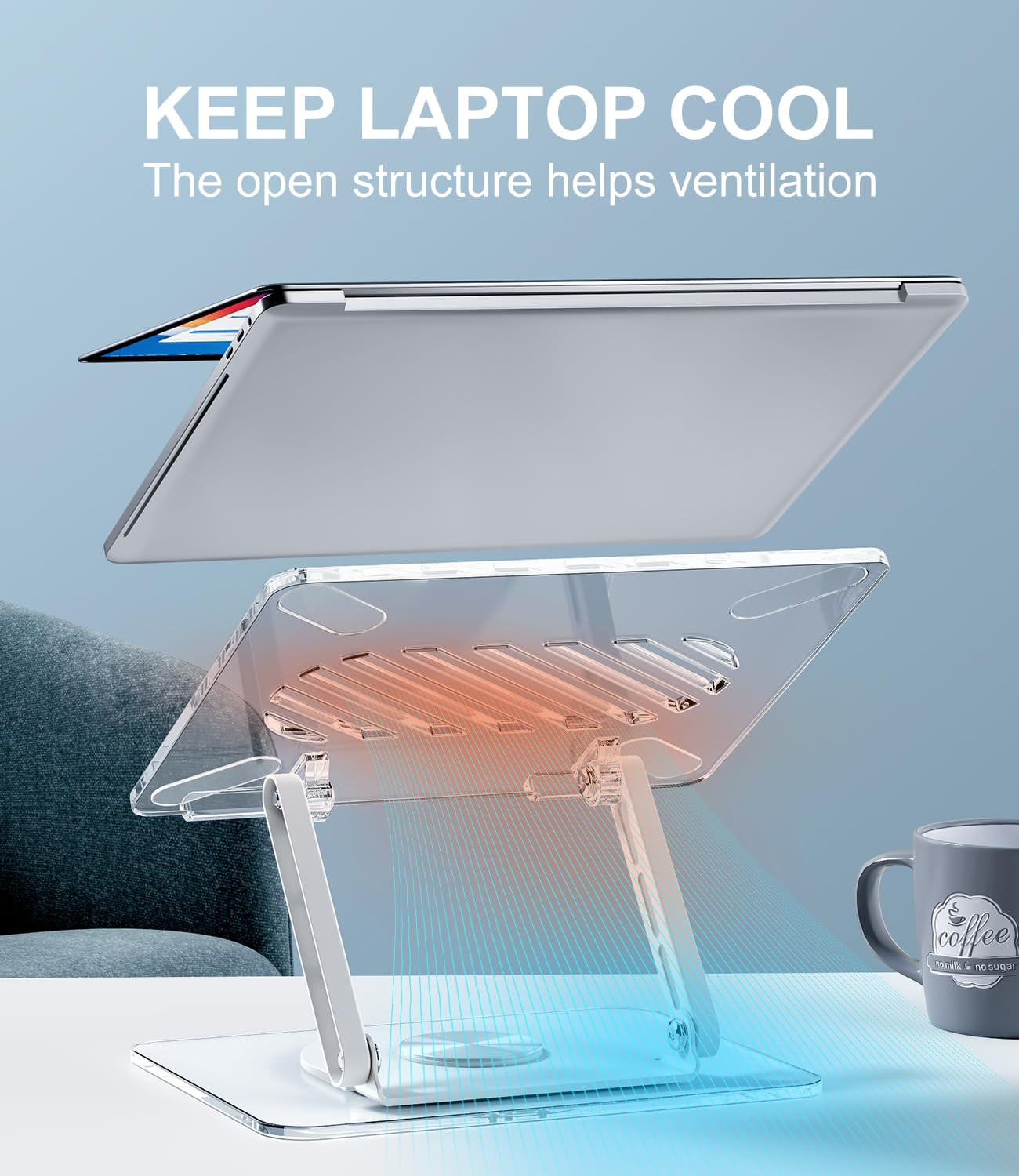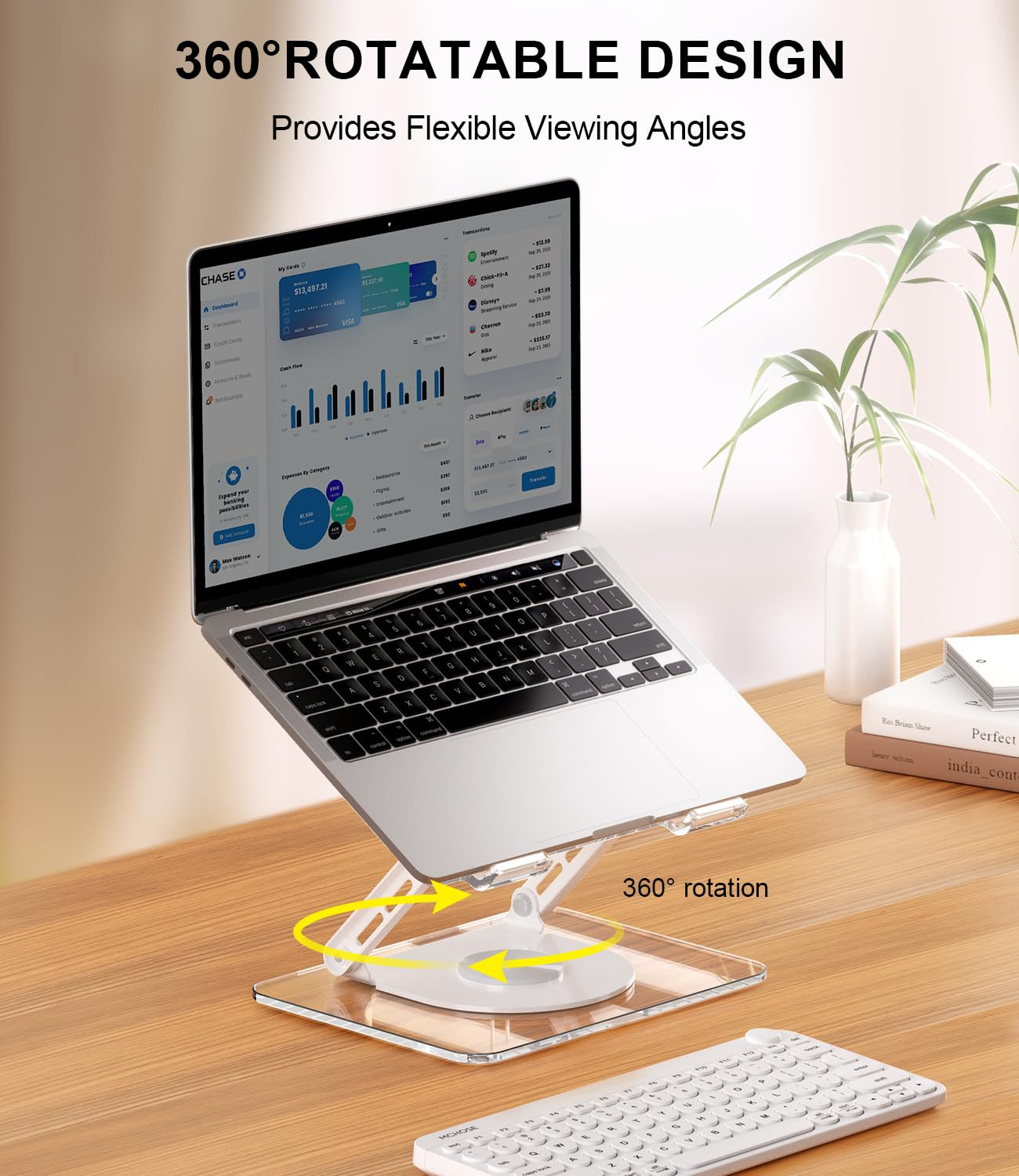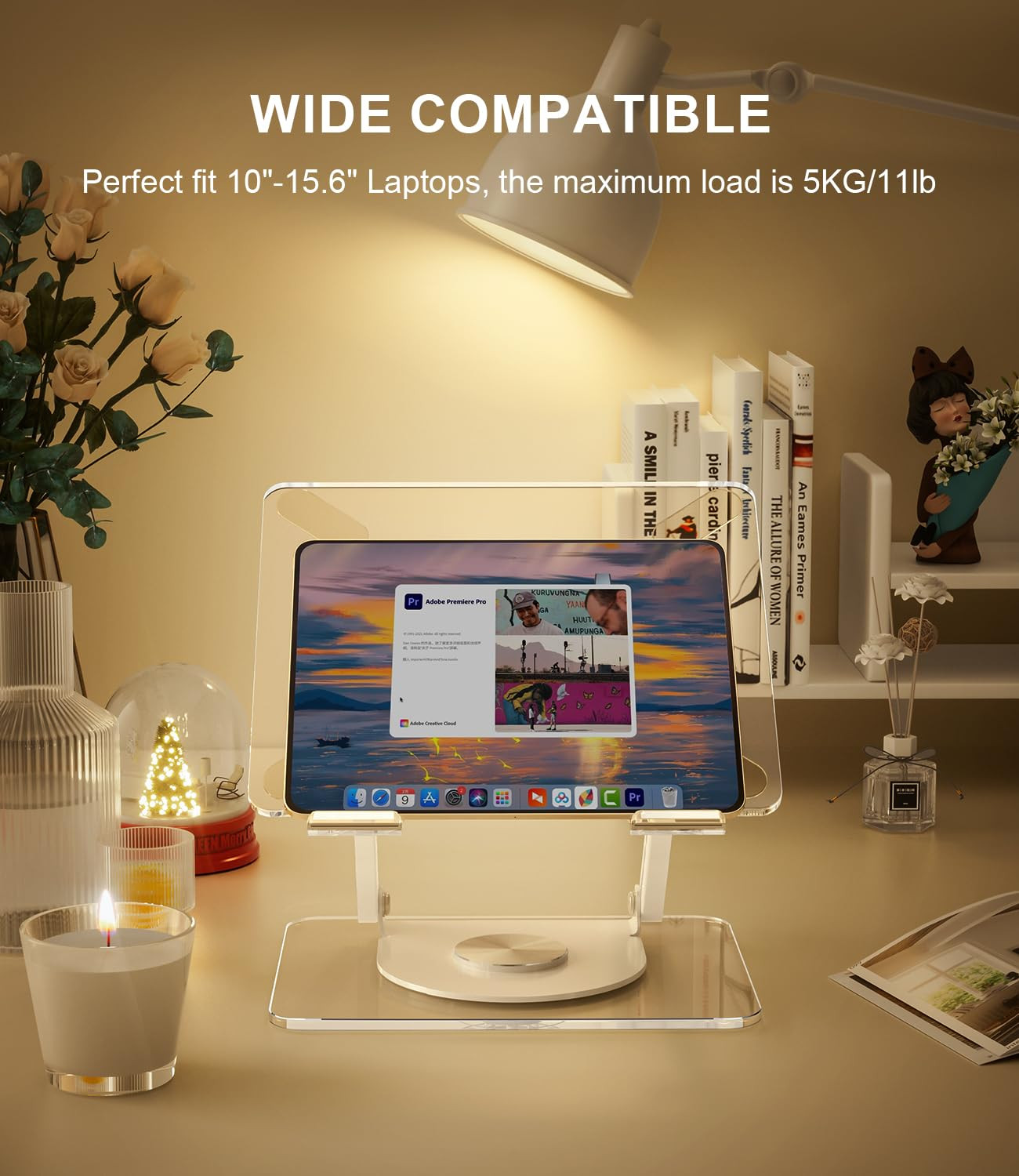 【Elegant and Stylish Design】acrylic laptop stand is made of transparent premium Class-A acrylic material. Its sturdy structure ensures the durability and security from breakage, support up to 8.8 lbs(4kg), no worry any wobble at all; the rubber on the holder hands sticks tightly, ensure your laptop stable on the stand and prevent any scratches. 【360 Degree Rotation】This clear laptop stand can rotates on its centered round base, allowing the top half of the stand to rotate infinitely in either direction. This give you plenty of flexibility in terms of working position. It will be especially useful for group projects or meetings. 【Heat Dissipation】 The acrylic laptop desk stand with multiple ventilation holes offers better ventilation and more airflow to cool your laptop, solve the concern of the weakened heat dissipation performance due to your long-playing use of computer. 【Wide Compatibility】The laptop raised stand acrylic supports all devices from 10-16 inches, whether working in home studies, office or conference room even on the messy desk, it is your best choice.Thank you for experiencing our innovative products. 【Multi-purpose】The clear laptop riser is perfect for the cluttered kitchen counter, table or small desk with its foldable design that also swivels to give everyone around the table easy access the laptop's screen. This stand is also a great choice if you’re using a second external monitor. Keeping both screen at the same height can cut down on eye strain, for more comfortable working conditions.
