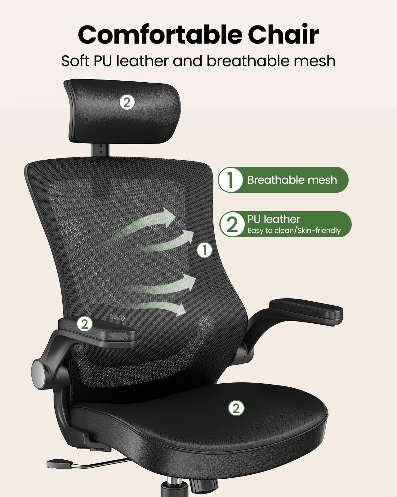 ✅HIGH-DENSITY FOAM SEAT: Our computer chair cushion boasts a stylish, saddle-shaped design that is both fashionable and attractive. Equipped with high-resilience foam, it distributes pressure evenly across the seat, providing superior comfort and support for extended periods of time. The seat has been durability tested up to 100,000 times, ensuring that you can use it with confidence and without worry ✅REAL-TIME ADAPTIVE BACKREST: The ergonomic office chair is equipped with an adaptive lumbar support that is adjustable by 2″ to properly match body height and shape. The S-shaped backrest is designed to better fit the spine for more effective lumbar support ✅UNIQUE COMFORTABLE FABRIC: This office chair features a headrest, seat, and armrests made of high-quality, skin-friendly PU leather that is soft and easy to clean. The backrest is crafted from breathable mesh with high elasticity and strong tensile strength, helping to keep your back cool and comfortable for extended periods. Our PU leather and mesh combination is an innovative design that prioritizes your maximum comfort ✅CUSTOMIZED COMFORT: With a wide range of customizable features, including an adjustable 2D headrest, backrest with a 90° to 120° tilt rocking angle, and 90° flip-up armrests, you can adjust the desk chair to find the optimal position for your neck, cervical spine, shoulders, and arms, providing maximum relaxation. You can also adjust the seat height to meet your work and daily needs ✅BUILT TO LAST: Our home office desk chairs features a Class 3 SGS gas lift that has been tested for durability up to 120,000 cycles, a strong five-leg base, 360° smooth swivel, and quiet caster wheels that roll easily on wood floors, carpet, and tile. Enjoy improved posture and true comfort with a ergonomic desk chair that is built to last with a weight capacity of 300 lbs