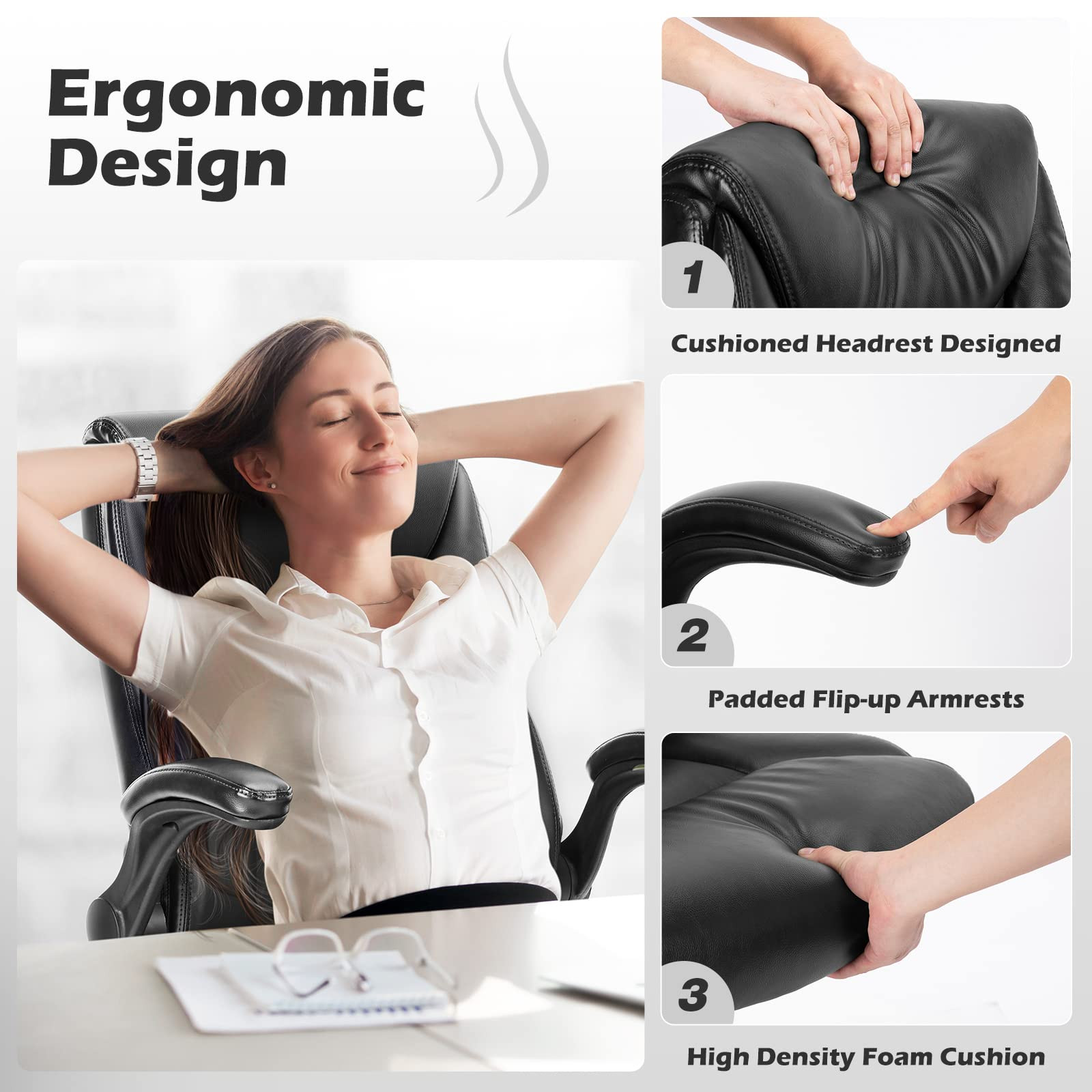 Soft Padded Leather Chair - This high-back office chair is made of waterproof and durable bonded leather, which is easy to clean. High-density foam pads reduce the load on the thighs and buttocks. The waterfall-shaped seat back wraps the lower back in all directions, making you feel comfortable for long periods of time. Adjustable Height Desk Chair - The height of the chair can be adjusted from 18"-22" through the handle, which is suitable for adults and teenagers to work and rest. The reclining device can adjust the angle of the seat back by 90°-120° and can enter the rocking and locking mode, which is suitable for different sitting positions. 360° Swivel Casters - There are 5 stable and durable pulleys made of PU material under the nylon base, which can bear 275 pounds of weight. The pulley can be rotated 360° and slide smoothly on floors of different materials without sound, which can greatly improve office efficiency. Easy to Assemble - The executive office chair is equipped with all the accessories, installation tools and instructions to make the installation more convenient and be completed within 20 minutes. We have also uploaded the installation video on the product page for your reference. Multi-function Designs - The 90 -120-degree rocking design meets your different sitting positions, and adjustable height design to meet the sitting needs of people of different heights. 360-degree rotation design allows you to adjust your position anytime and anywhere.
