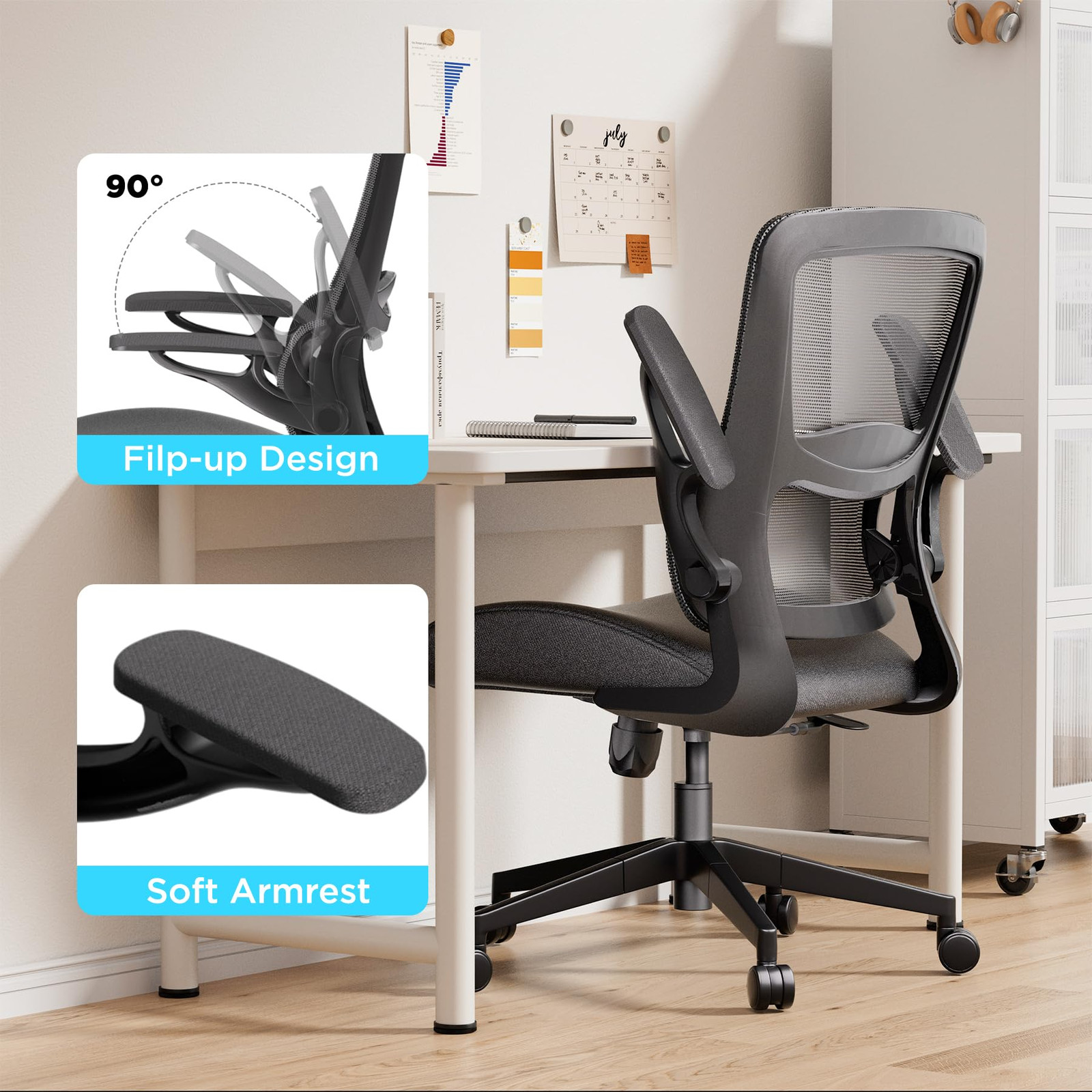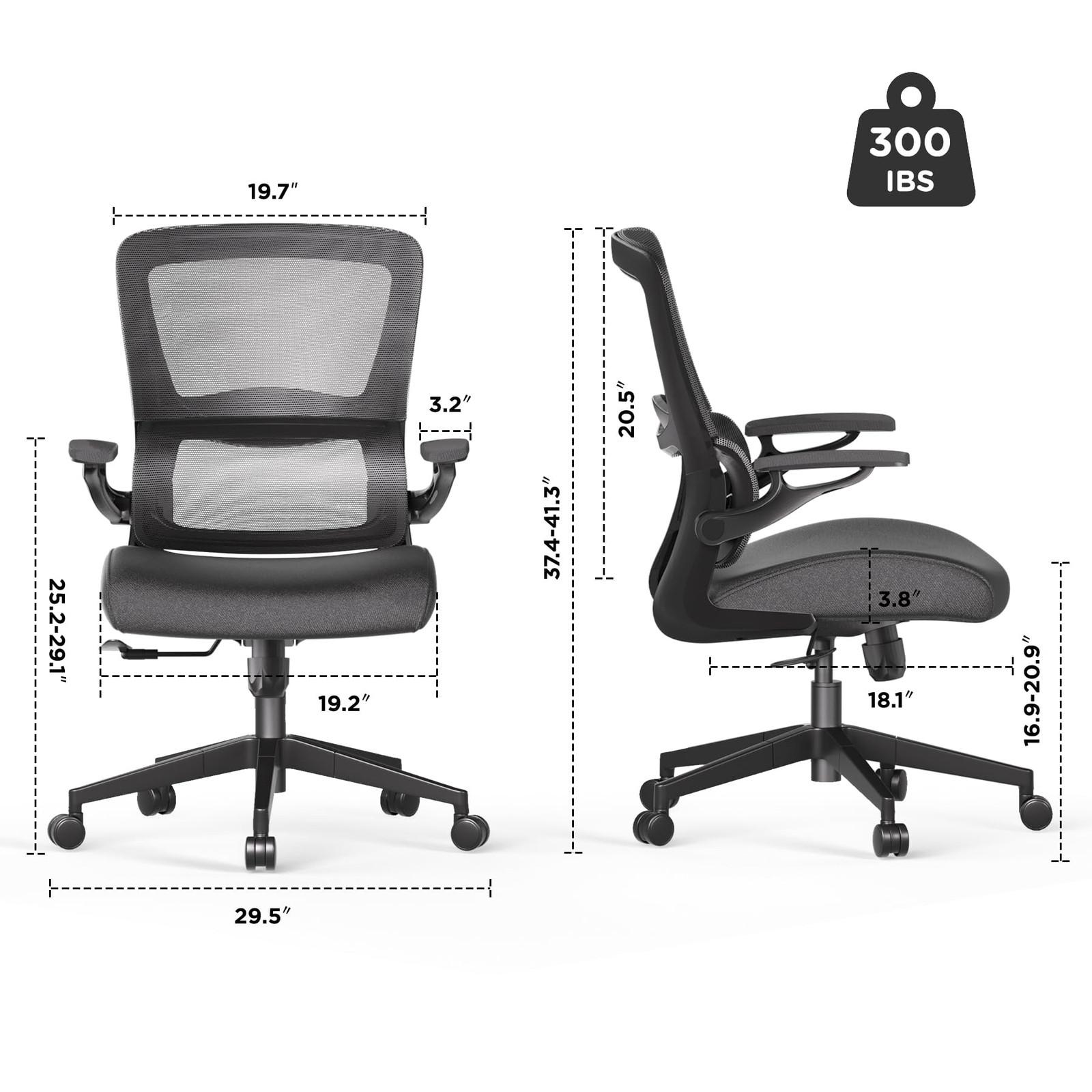 Space-Saving Design with Flip-Up Armrests: This ergonomic mesh office chair features flip-up armrests and a compact design, making it ideal for home offices, gaming, or study spaces. It maximizes your workspace without compromising on comfort. Advanced Ergonomic Lumbar Support: Enjoy exceptional lumbar support with a breathable mesh back and high-back design. The 3.8" thick cushion ensures long-lasting comfort, perfect for extended work or gaming sessions. Fully Adjustable for Personalized Comfort: With 4" height adjustment and a 90°-125° tilt function, this office chair adapts to different body types. The 360° swivel and adjustable height offer a custom seating experience for students and professionals alike. Durable and Reliable Build: Designed for daily use, this office chair supports up to 300 lbs with a robust metal base and SGS class-3 gas lift. The high-density foam cushion and durable mesh provide consistent comfort and stability. Easy Assembly with Comprehensive Support: Assembling your chair is quick and easy with the included manual and tools, taking just 30 minutes. Enjoy peace of mind with a 60-day replacement service, 5-year warranty on parts, and 24/7 customer support.