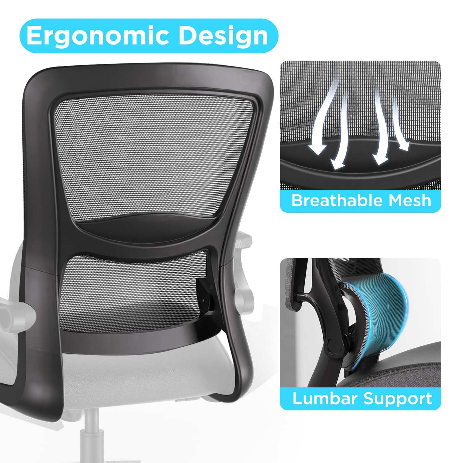 This ergonomic mesh office chair is a game-changer for small spaces! The flip-up armrests save room when not in use, and the breathable mesh keeps me cool during long work sessions. The lumbar support is fantastic—no more back pain after hours at the desk. The thick cushion stays comfy all day, and the adjustable height makes it perfect for any setup. Great for work, gaming, or studying—highly recommend!