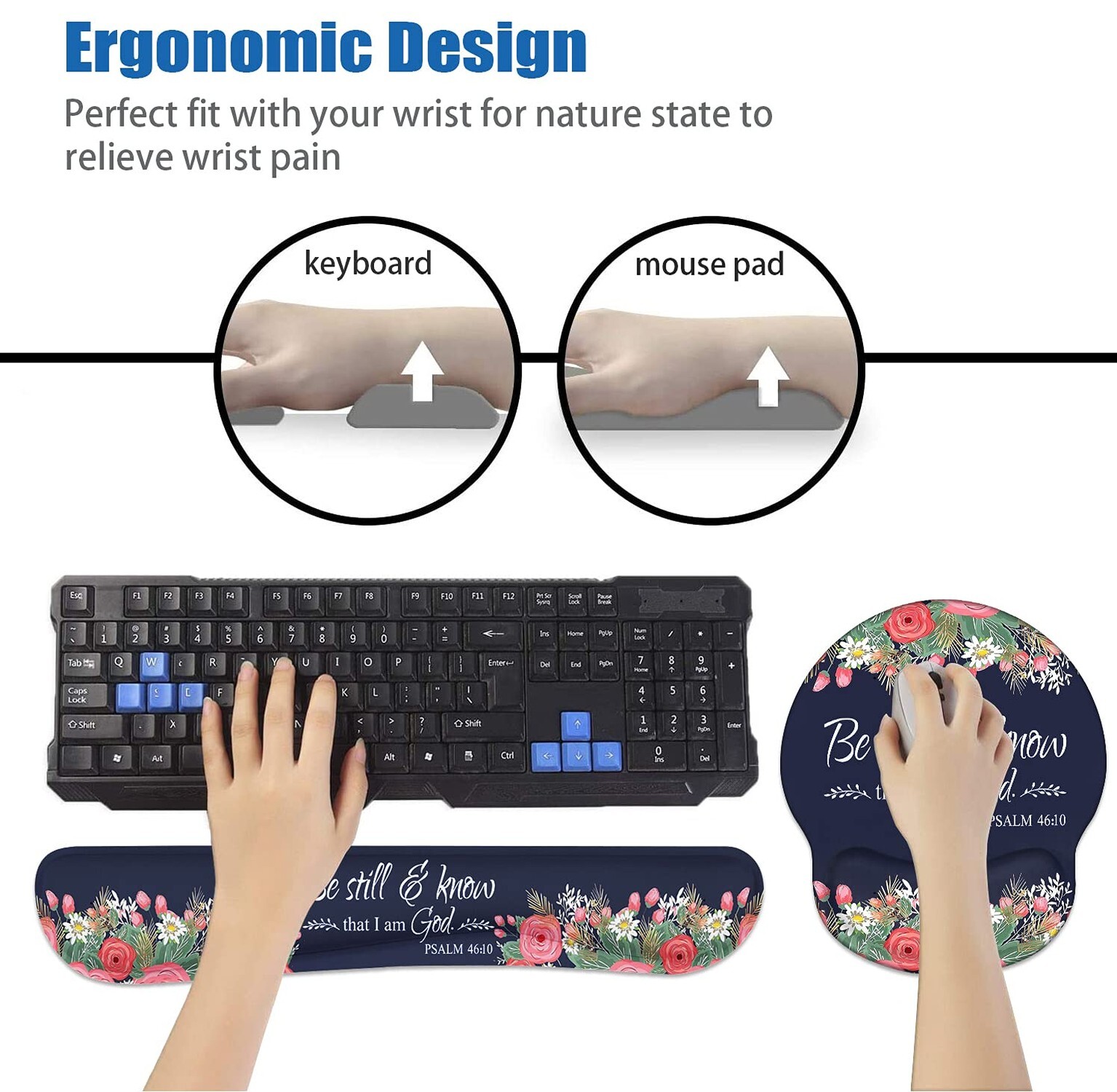 Keyboard Wrist Rest and Mouse Pad Support, Non-Slip PU Base Ergonomic Gaming Mousepad for Home Office Working Studying Easy Typing & Pain Relief - Floral Quote Bible Verses Psalm 46:10 ✓ Free 60 Day Returns ✓ Free Express Shipping Description: Ergonomic mouse pad with wrist support + keyboard wrist rests + cup coaster set for Home/Office/Work/Study?? Are you looking for wrist rest mouse pad set with vivid images in bright color??? Do you want to get a PC accessory to prevent carpal tunnel issues?If Yes, we just solve your problems NOW, LOWORO gaming mouse pad with wrist support set is the right choice for you.Why You Choose Us? Wrist pad arc design fits the human wrist joints to keep the wrist in a natural and comfortable state.? Keyboard wrist & Mouse Wrist is made of cushioned neoprene, Non-toxic, no odor, harmless to health.? Allows more accurate and more fast mouse movement, and provides excellent point and click precision.? Non-slip rubber base provides heavy grip preventing sliding or unwanted movement.Suitable for different surface conditions.? High-definition printing, bright colors, easy to clean, not easy to fade.? Wrist support mouse pad with vivid printing, an exquisite attachment for home, office. An Ideal gift for families, friends, co-workers, etc.Product SpecificationMaterial: Comfortable Gel, Non-slip PU base and Lycra silky cloth surfaceWrist Filling Material: Memory formProduct Size: Mouse Pad Wrist Support ( 9.84'' x 8.66'' x 0.86'' ); Keyboard Wrist Rest Pad ( 17.32'' x 3.34'' x 0.98'' ); Coffee Coaster ( 4'' x 4'' x 0.08'' )Package Included1 x Mouse Pad with Wrist Support1 x Wrist Pad for Keyboard1 x Cute Coffee CoasterNow, click ''ADD TO CART'' to get a worthy wrist rest pad set for mouse and keyboard. Features: WHAT YOU GETAn ergonomic memory foam keyboard wrist rest pad (17.32 x 3.34 inch) & A soft memory gel mouse pad wrist support (9.84 x 8.66 inch) & A cute matching coffee coaster (4 x 4 inch). Wide use for gaming, computer, office, laptop and so on. ERGONOMIC DESIGNThe design of these two wrist rests fits perfectly on the wrist. Provide soft support to relieve the pressure, fatigue and pain of your wrist. The height of the wrist rests is the same as the height of the wrist when using the keyboard or mouse, keeping your wrist in a natural and comfortable state. NON-SLIP BOTTOM DESIGNThe bottom of the keyboard wrist adopts anti-skid natural rubber material. The bottom of the Mouse Wrist with Semi-adhesive PU Base.They can be firmly fixed on the desktop to prevent sliding. You can enjoy stable mouse or keyboard operation at work or in game. EXCELLENT QUALITYThis keyboard wrist rest has smooth lycra fabric, will allow you ease moving your mouse meanwhile the Ergonomic mouse pad make a precise positioning, gives your hand a cosy environment to operate your mouse. The soft memory foam-filled cushion part will slowly bounce back when your hand leave it, not easy to out of shape. ELEGANT LOOKApplied excellent printing technology, the patterns of our cute keyboard wrist rest and Ergonomic mouse pad are clear , colorful and never fade. it is not just a mouse pad, its more a good partner when youre working or studying, Multiple styles available for your choice. Best Gift Idea. Product Details: Size: Medium Material: Polyurethane (PU) Color: Floral Quote Bible Verses Psalm 46:10 Brand: LOWORO Product Dimensions: 17.32"L x 3.34"W Style: Gaming Special Feature: Ergonomic, Non slip, Wrist Support Keyboard Description: Gaming Compatible Devices: Mouse, Keyboard Fill Material: Memory Foam Form Factor: Ergonomic Shape: Floral Manufacturer: LOWORO UPC: 754302168684 Item Weight: 13.1 ounces Product Dimensions: 17.3 x 7.5 x 0.98 inches Item model number: LWR-Wrist Rest-L03 Material Type: Polyurethane (PU) Manufacturer Part Number: LWR-Wrist Rest-L03 Date First Available: August 27, 2021