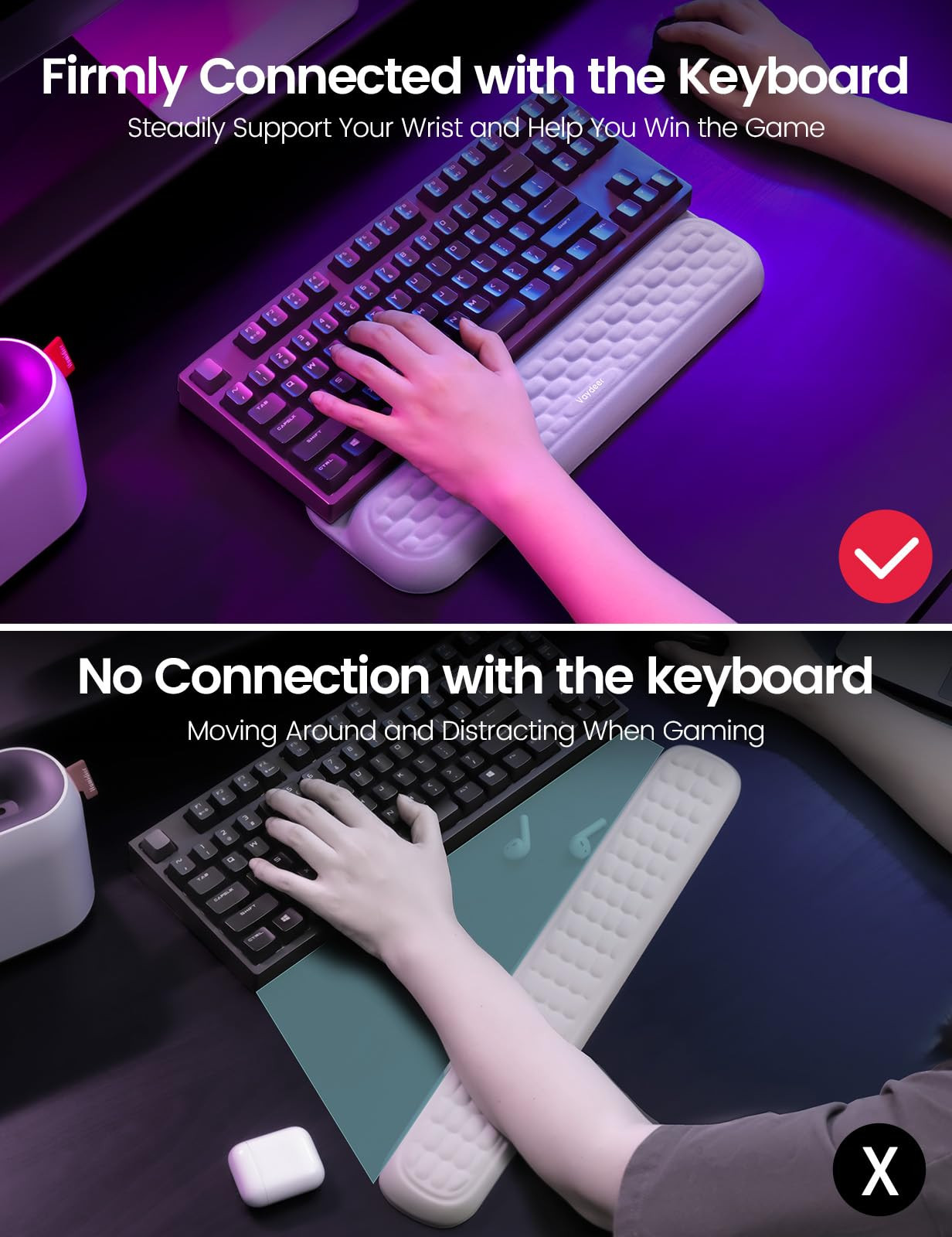 【The and Only Wrist Rest with Stickers】Our keyboard wrist rest is the only on the market deigned with 2 special stickers for absolute stability. It came with 2 adhesive double sided stickers, enable you to affix them firmly to the bottom of your keyboard. No more unwanted keyboard moving when gaming and working. Keep your wrist rest in place and enjoy uninterrupted comfort. 【Enhanced Support Stability】Most keyboard wrist support from other brands are easy to slide around in your usage. Instead, keyboard wrist pad keeps your keyboard sturdy during intense gaming sessions and focused work hours even though you place it on a smooth surface. No slipping, no distractions. 【Suit Best for Mechanical Keyboards】This computer wrist rest(size: 14.1×4.58×0.98inch) is with 60%-75% mechanical keyboards with tall keycaps. Those high-end mechanical keyboard with wrist rest costs over $100, but now with this wrist rest pad, you can customize like that easily. It’s your top choice for high cost-performance ratio. 【Ergonomic Design for Better Experience】meticulously designed ergonomic keyboard pad perfectly aligns with your natural hand position, allowing for optimal comfort and reduced strain. It’s super cushiony for your hands to lay flat on the keys without over-arching. You will enjoy maximal ergonomic positions of your hands and wrists. 【Soft Memory foam Texture】Crafted with soft memory foam and covered in breathable skin-like Lycra fabric. Our keyboard rest wrist pad offers you super comfortable wrist support. The fabric cover reduces friction and allows for smoother wrist movement. This ensures that your wrists can glide effortlessly across the surface. 【Your Essential Companion & Perfect Gift】The keyboard rest is an essential office accessory for working, typing, browsing, online chatting, gaming, etc. Make every moment at your desk a comfortable . It can also be a great gift for men, women, coworkers, families, friends, teachers and so on.