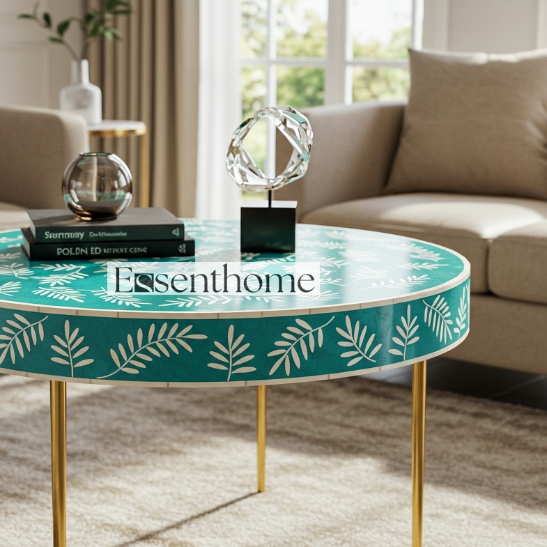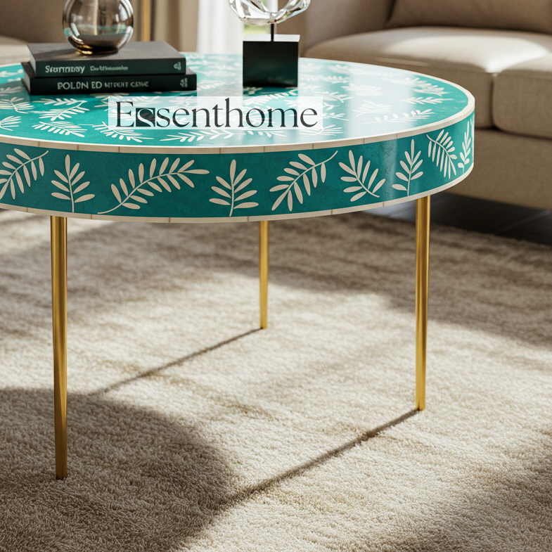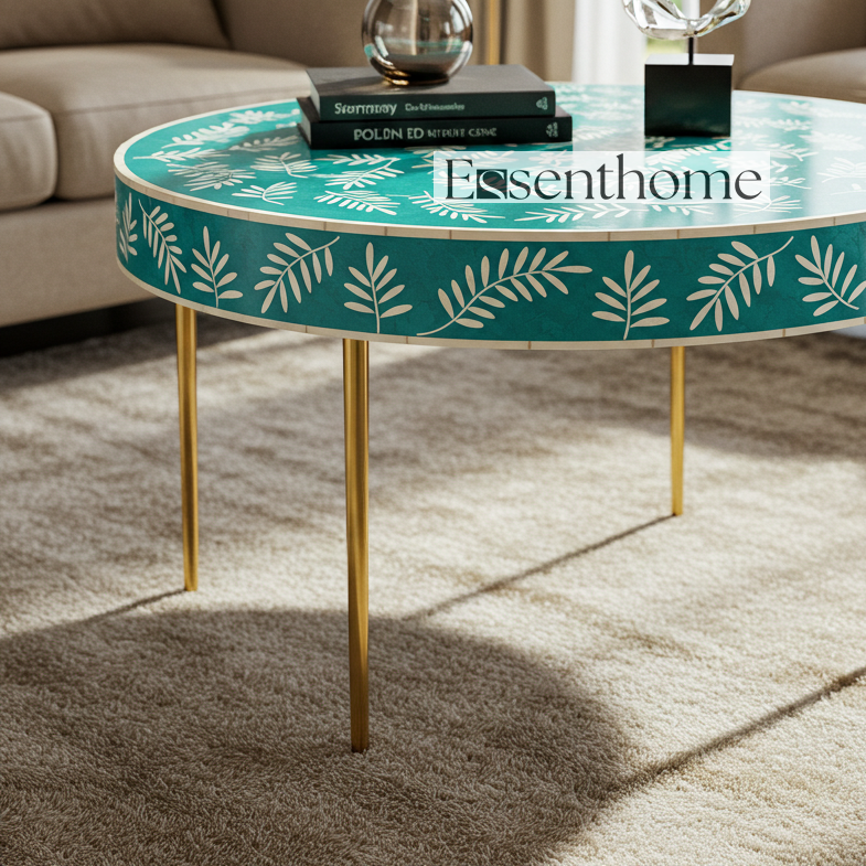 Bring artisanal charm and modern elegance to your home with the Essenthome green Bone Inlay Round Coffee Table. Handcrafted by skilled artisans, this stunning table features a white floral vine bone inlay set against a bold green resin backdrop. The round tabletop rests on sleek gold-finished metal legs, blending traditional craftsmanship with contemporary style. Perfect as a coffee table, center table, or decorative accent piece, it instantly elevates living rooms, lounges, or sitting areas. The solid wood construction ensures durability, while the intricate inlay design makes each table a one-of-a-kind statement. Whether styled with books, vases, or decorative trays, this luxury bone inlay coffee table brings timeless beauty and functionality to your space. Each piece may feature slight variations in color and pattern, highlighting the uniqueness of handmade furniture. Brand: Essenthome Material: Ethically sourced bone, green resin, solid wood base Design: Handcrafted white floral vine bone inlay pattern Shape: Round tabletop for a modern accent look Base: Sturdy gold-finished metal legs Style: Luxury handmade furniture with artisan detailing Versatile Use: Perfect as a coffee table, center table, or statement accent in living rooms Care Instructions: Wipe with a soft, dry cloth. Avoid moisture and direct sunlight. Origin: Handcrafted in India