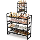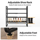 This 4 tier shoe rack can be extended from 18.6" to 30.5" and hold up to 16 pairs of shoes on the shelves, which is perfect space solution for shoes organization, and you can adjust the height of the shoe stand to fit taller boots as per your needs. Well-made of heavy-duty metal material with black coated finish and sturdy constructure, our shoe rack will not sag, collapse, rust and deform, while the adjustable feet ensure it stays stably on uneven grounds. It will serve for a long time. Expandable Shoe Rack: This 4 tier shoe rack can be extended from 18.6" to 30.5" and hold up to 16 pairs of shoes on the shelves, which is perfect space solution for shoes organization of small place, garage, entryway, closet and living room. Height Adjustable and Stackable: You can adjust the height of the shoe stand to fit taller boots as per your needs. Meanwhile, the 4 tier shoe organzier can be purchased more to stacke into 6-tier, 8-tier, 10-tier and even 12-tier to maximize the vertical space. Perfect for High Heels: The shelves of our shoe rack is specifically constructed from mesh wire grip that is taut enough to keep heels from teetering over. Compared with other flimsy plastic shoe racks or thin wire metal shoe racks, our shoe rack features better compatibility and durability. Built to Last: Well-made of heavy-duty metal material with black coated finish and sturdy constructure, our shoe rack will not sag, collapse, rust and deform, while the adjustable feet ensure it stays stably on uneven grounds. It will serve for a long time. Easy Assembly and Cleaning: This shoe rack can be assembled less than 10 mins with simple structure design. A detailed user manual and instructional video are also provided to simplify the assembly process. And you can rinse or wipe the rack to keep it clean. This rack would be a reassuring choice for you to organize the shoes.