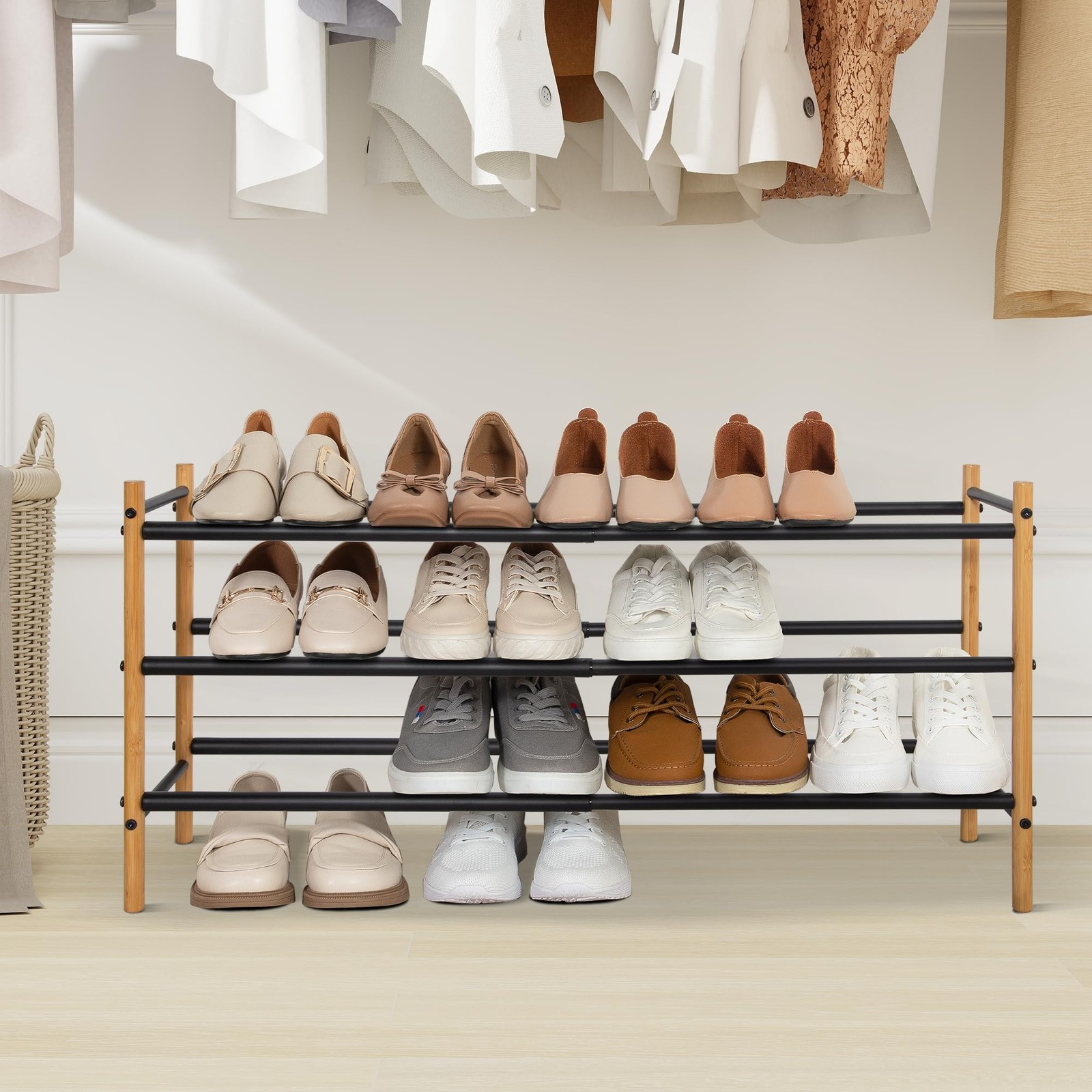 This expandable bamboo shoe rack is designed with both functionality and aesthetics in mind. Perfect for any entryway, closet, or living room, it features a durable bamboo and metal construction that ensures longevity and stability. The adjustable width allows it to fit seamlessly into small spaces, making it an ideal shoe storage solution for apartments, homes, and offices. Easy to assemble, this 3-tier shoe organizer not only saves space but also adds a touch of elegance to your decor. Whether you need a shoe rack for the front door, an adjustable shoe rack for the bedroom, or a sturdy shoe organizer for the garage, this versatile shoe rack is the perfect addition to any space. 【EXPANDABLE】Expanded from 17.72" to 32.48", adjustable design allows you to customize to fit your space, perfect solution for organizing shoes in your closet, garage, entryway, bedroom, or small spaces. 【Sturdy and Durable】Made of high-quality metal materials, which have excellent durability and sturdiness, it is capable of accommodating various types of shoes, ensuring long-lasting storage. It also adds natural beauty to your home. [Versatile for Any Room] With its simple and compact silhouette design, this frame shoe rack adds a touch of warmth to your room, make it perfect for your closet, entryway, bedroom, or living room, or any other small space. [Easy to Assemble] Simple structure design makes it very easy to assemble, have a tidy and organized home in few minutes. [Easy to Clean] Featuring a smooth coating, this shoe storage organizer can be easily wiped clean with a soft, damp cloth, saving you time and energy.